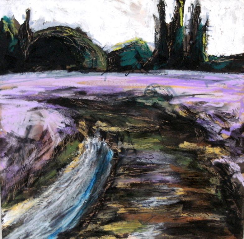 Oliepastel schets van de Veluwse heide in september. Compleet met zwarte baklijst (23.5 x 23.5 cm)