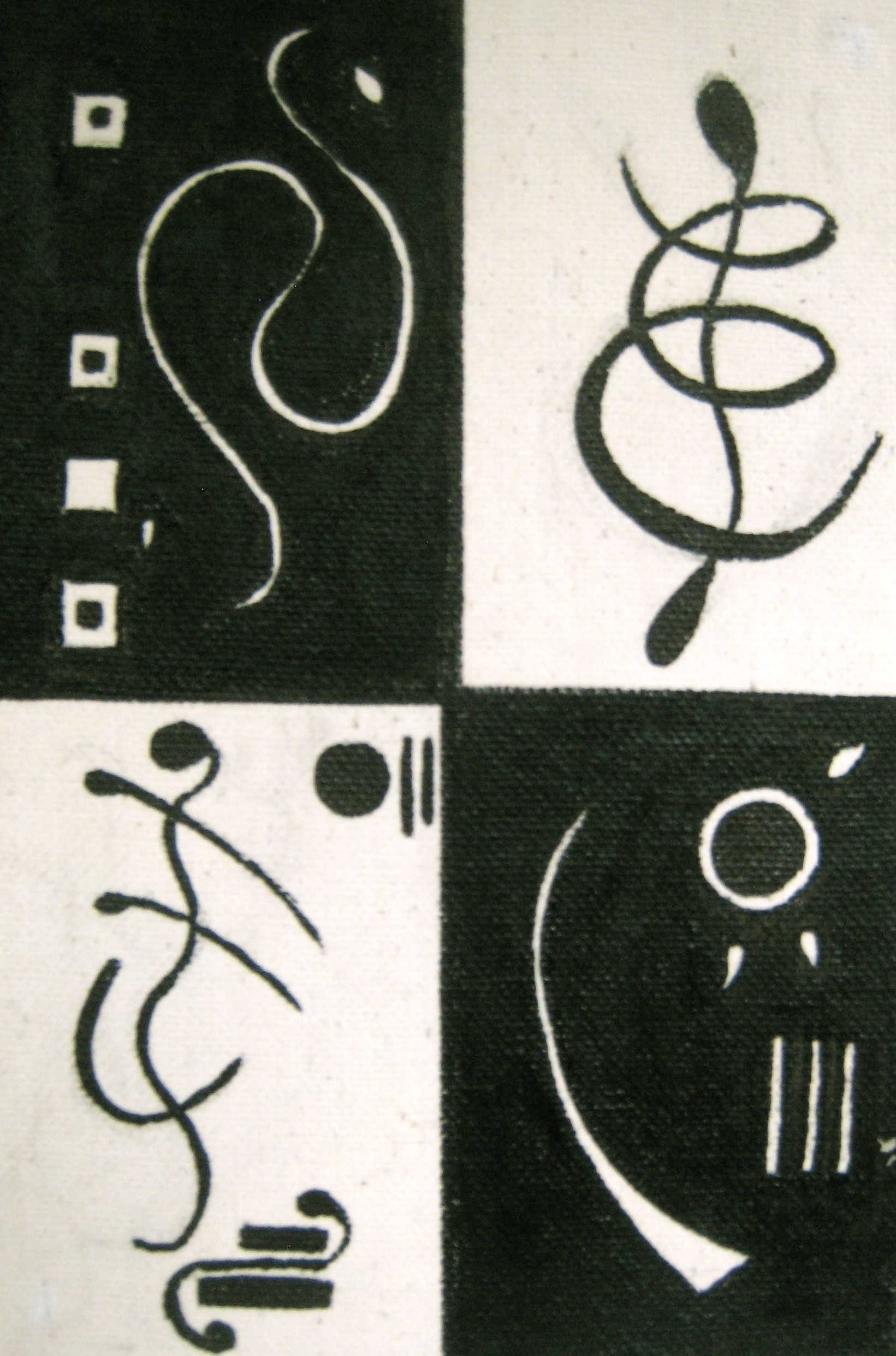 "De kunst van het weglaten... een subtiel lijnenspel, krachtig in zwart/ecru." Dit kleine werk is geschilderd op onbewerkt linnen. Het maakt deel uit van het drieluik "A Woman's Dance".