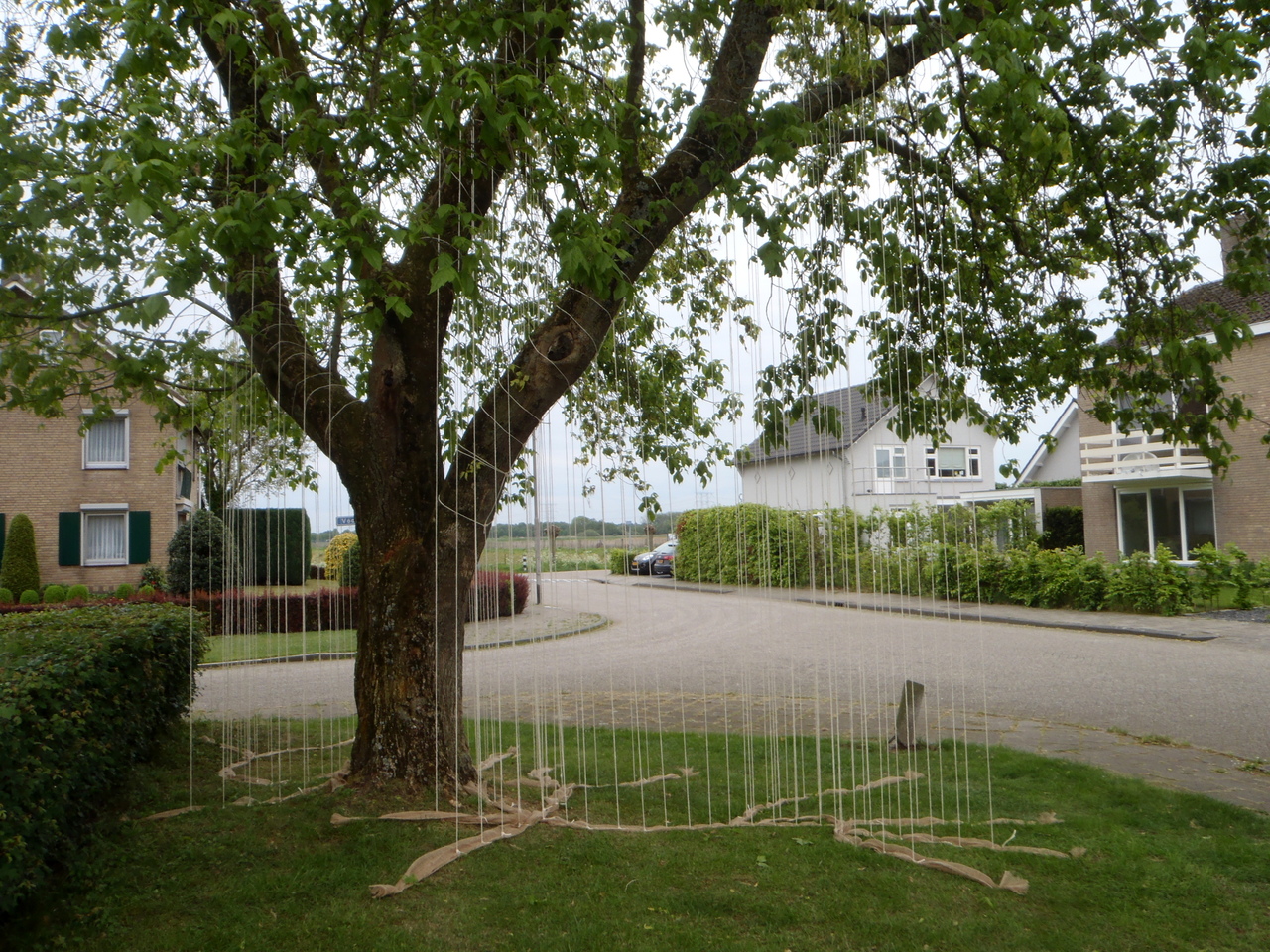 Voor Kunst en Bomen in Oisterwijk, Moergesteld en Heukelum maakt ik een installatie in een boom in Moergestel. "Deze boom staat praktisch op het middelpunt van de Benelux. Het maakt de boom niet uit, hij is vooral het middelpunt van zichzelf. De stam het middelpunt van de takken, hoe vreemd die ook gegroeid zijn. Eerst de ene kant op, dan de andere. Dikke takken stijl omhoog, dunnere meer horizontaal. Ze komen voort uit de stam, uit de kern. De projectie van de boom op de grond en de verbindingen tussen de takken en de grond: ze laten u de boom anders beleven. Helaas werd het werk al zeer snel vernield, en is het niet meer te bekijken.