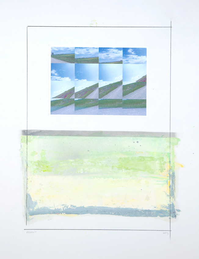 Het werk van Eelco E.de Wit(1955) gaat uit van de 2D 'werkelijkheid'.Plat gezegd plaatjes die kunnen variëren van folders, reproducties uit de kunstgeschiedenis en foto’s uit het leven die ongekende vrijheid bieden om z’n eigen 'ding' te maken.Van plaatje naar de verwezenlijking van een nieuw soort vanzelfsprekende Werkelijkheid, waarbij de bronnen soms duidelijk zijn, maar daarmee ook de Verschillen.Conceptueel (idee en verhaal) komen er spelenderwijs steeds meer lagen in het werk.