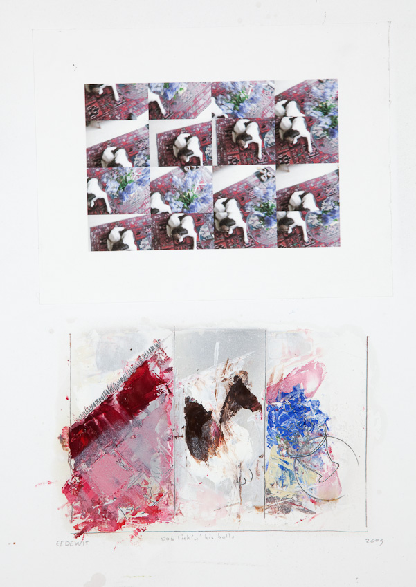 Het werk van Eelco E.de Wit(1955) gaat uit van de 2D 'werkelijkheid'.Plat gezegd plaatjes die kunnen variëren van folders, reproducties uit de kunstgeschiedenis en foto’s uit het leven die ongekende vrijheid bieden om z’n eigen 'ding' te maken.Van plaatje naar de verwezenlijking van een nieuw soort vanzelfsprekende Werkelijkheid, waarbij de bronnen soms duidelijk zijn, maar daarmee ook de Verschillen.Conceptueel (idee en verhaal) komen er spelenderwijs steeds meer lagen in het werk.