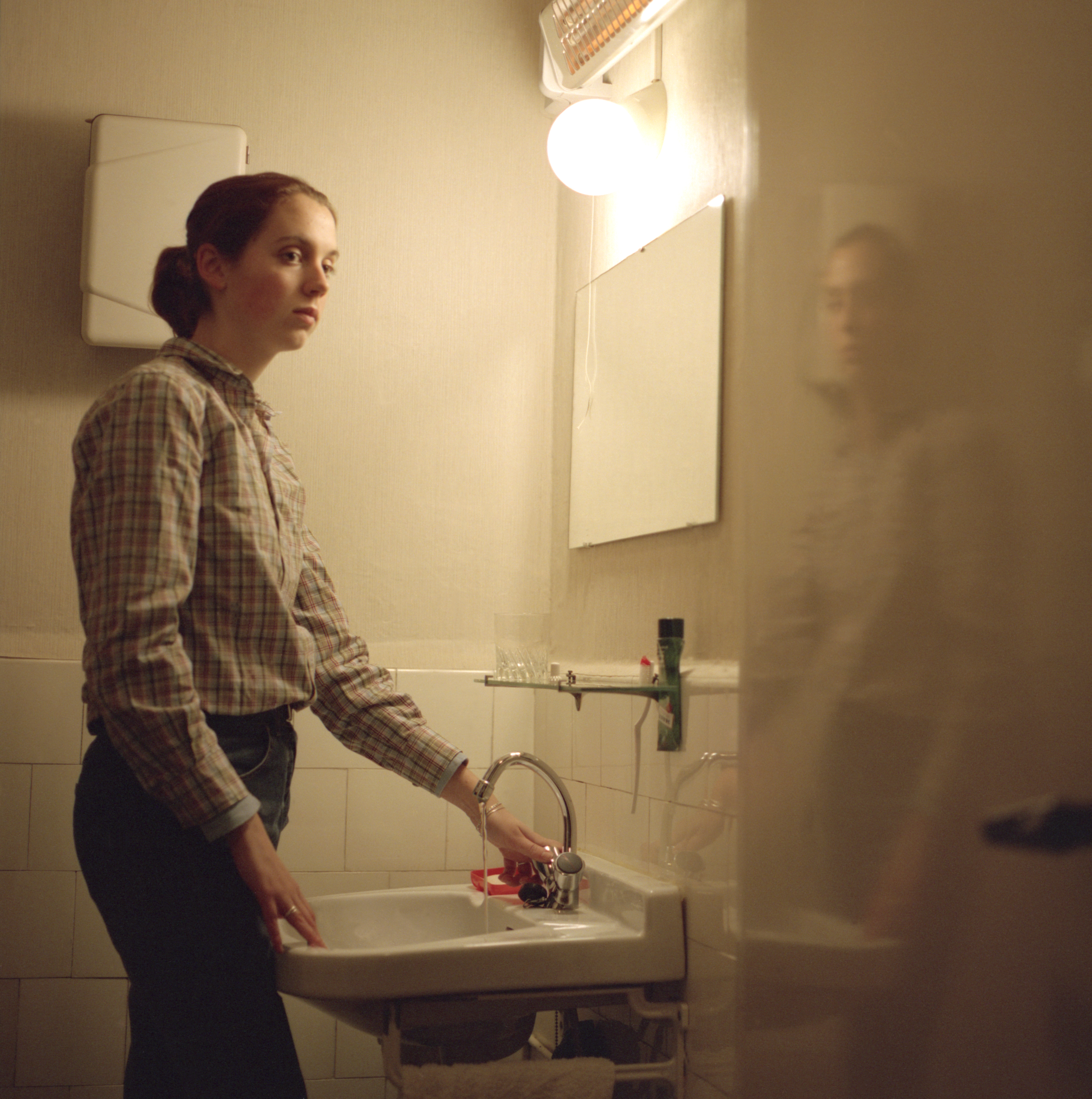 Zelfportret in de badkamer C-print op 1.5 mm aluminium voorzien van ophangsysteem. Tegen meerprijs ook beschikbaar als Plex-photo
