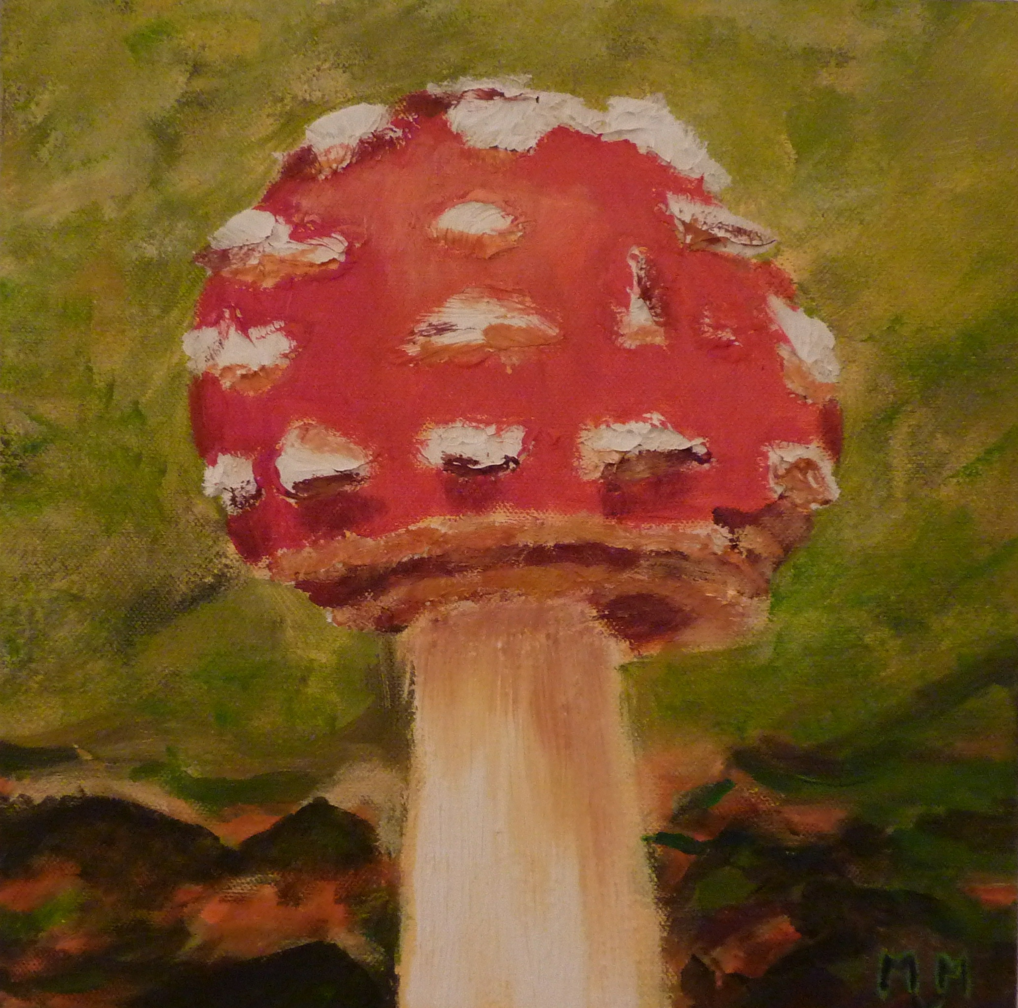 Een grote paddestoel rood met witte stippen. De witte stippen zijn tastbaar op het schilderij wat een extra dimensie geeft. Een kleurrijk en warm schilderijtje. Ik heb hem samen opgehangen met 'Herfstpaddestoelen' en 'Slakje'.