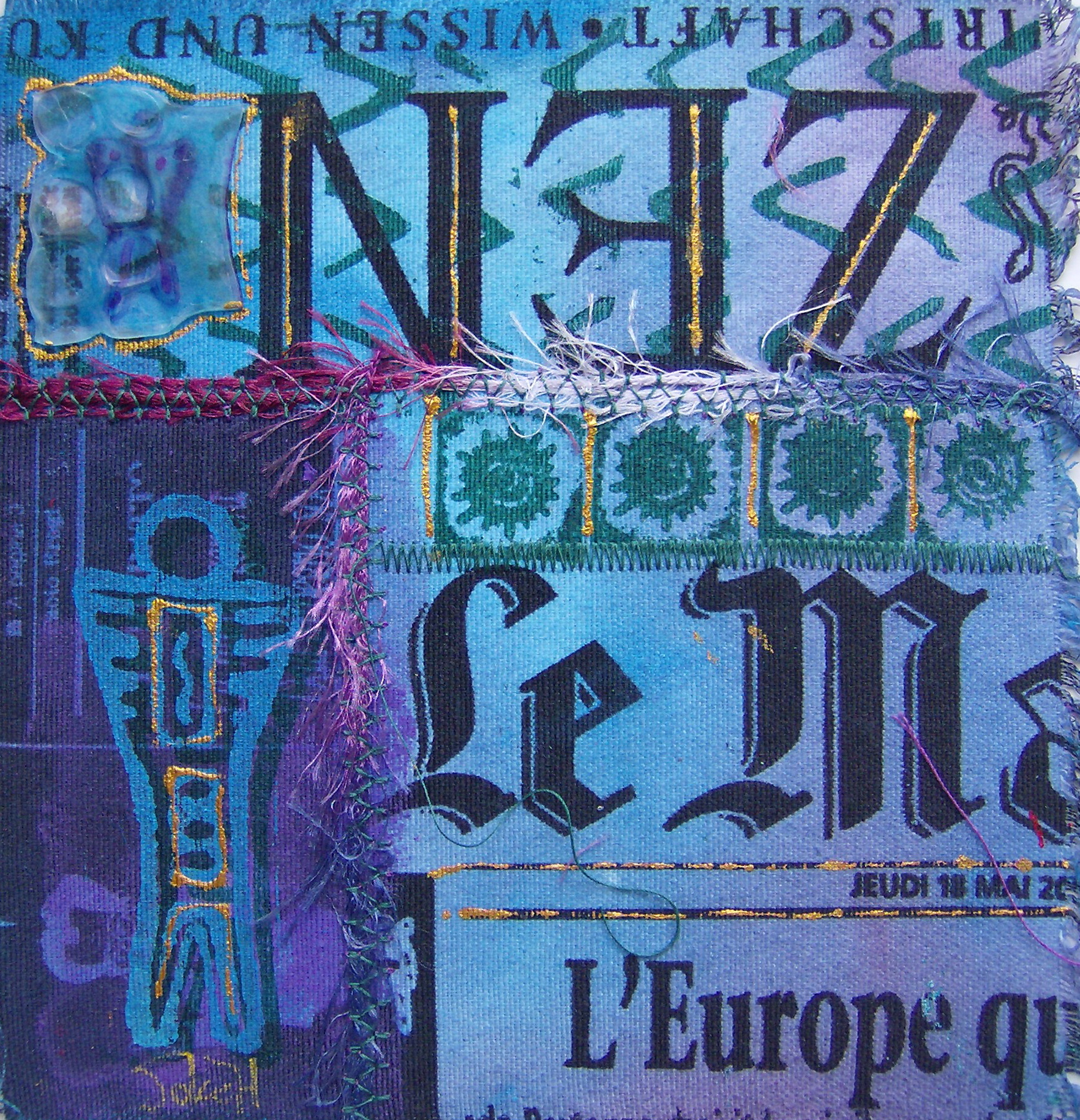 Kleine collage. Er is gebruik gemaakt van o.a. stempels, acrylverf, tyvek, diverse draden en garens, knopen, koper. Voor meer foto's zie http://werk2009.waterleliedesign.nl/#home