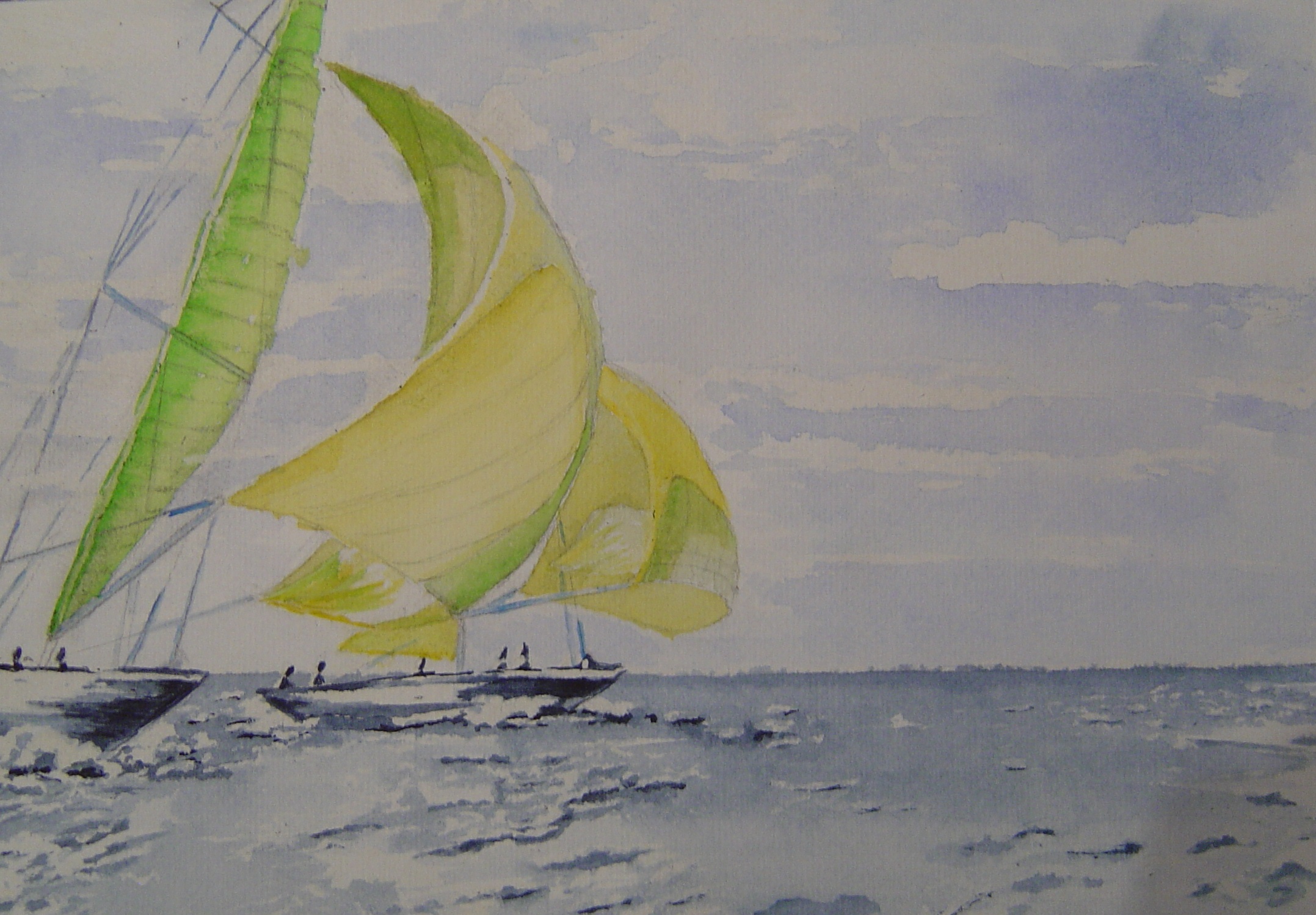2 zeilboten hebben de wind in de zeilen. Ingelijst met een blauwe en creme passepartout in een witte lijst.