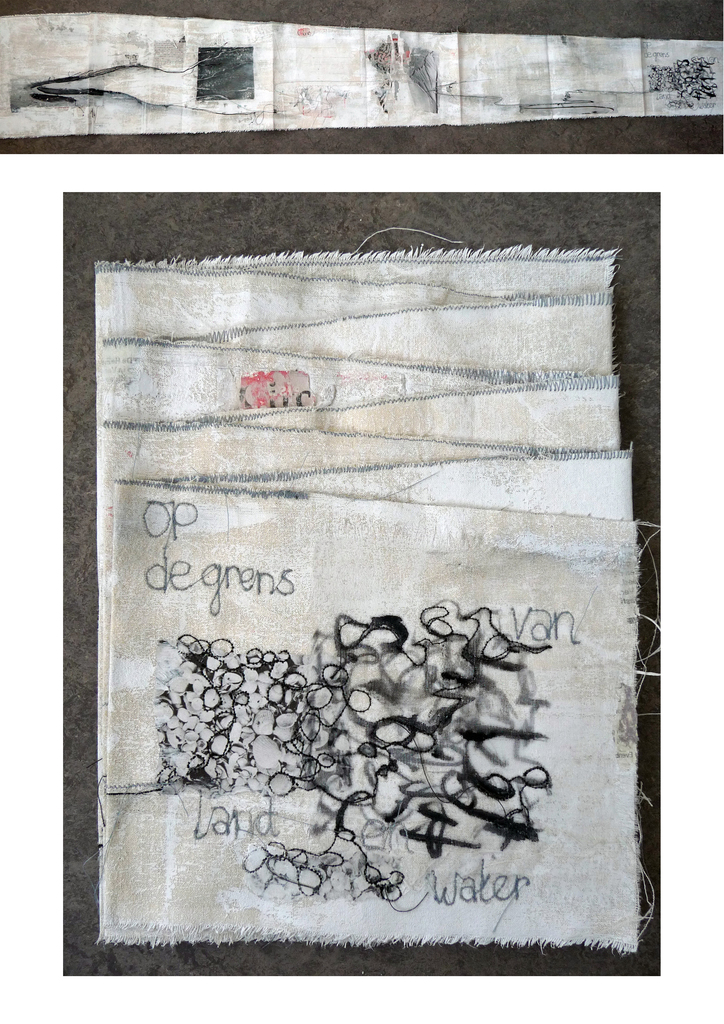 Wat zie je allemaal op de grens van land en water. Boekje met zigzag binding in gemengde techniek. O.a. machinaal borduurwerk, schilderen, schrift en collage.
