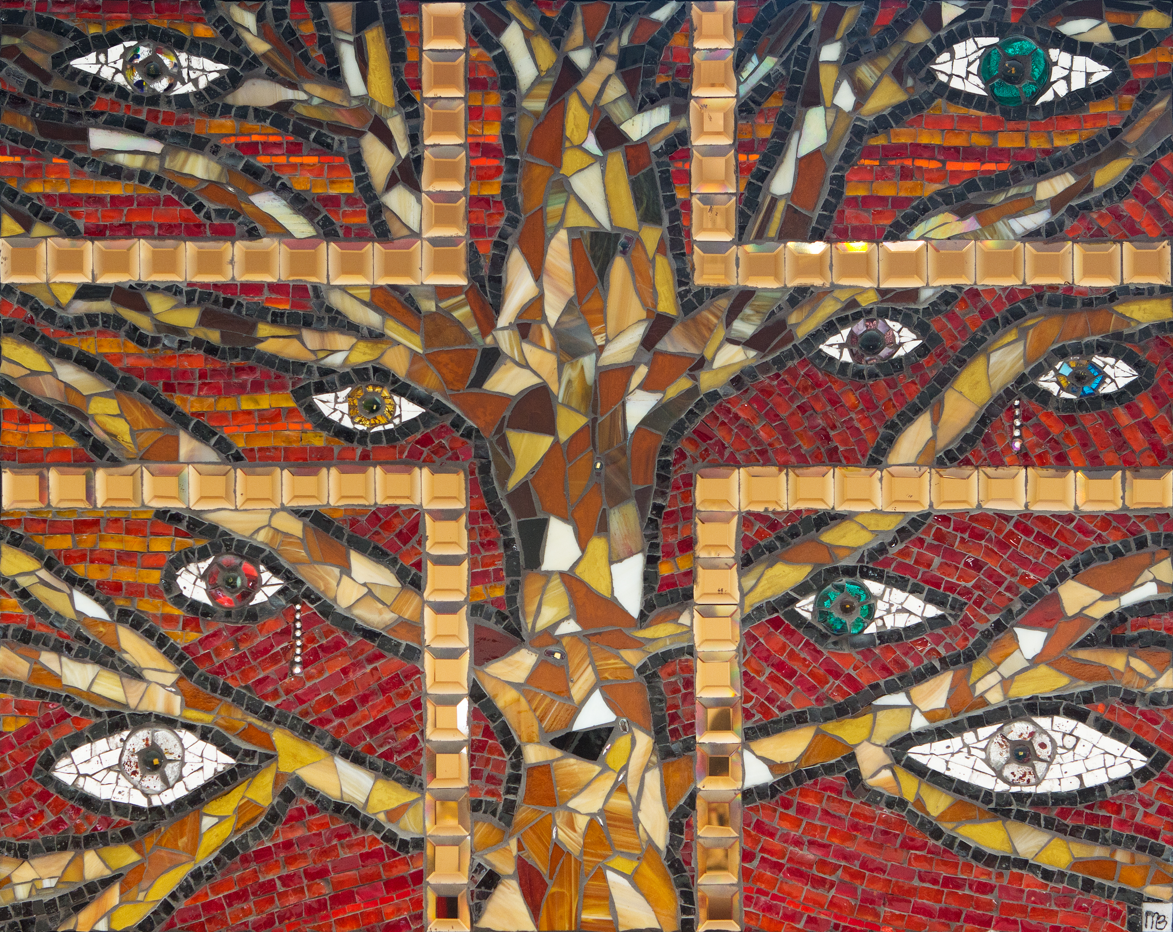 Mozaiek met handgesneden glas, smalti, glaskralen, en goud