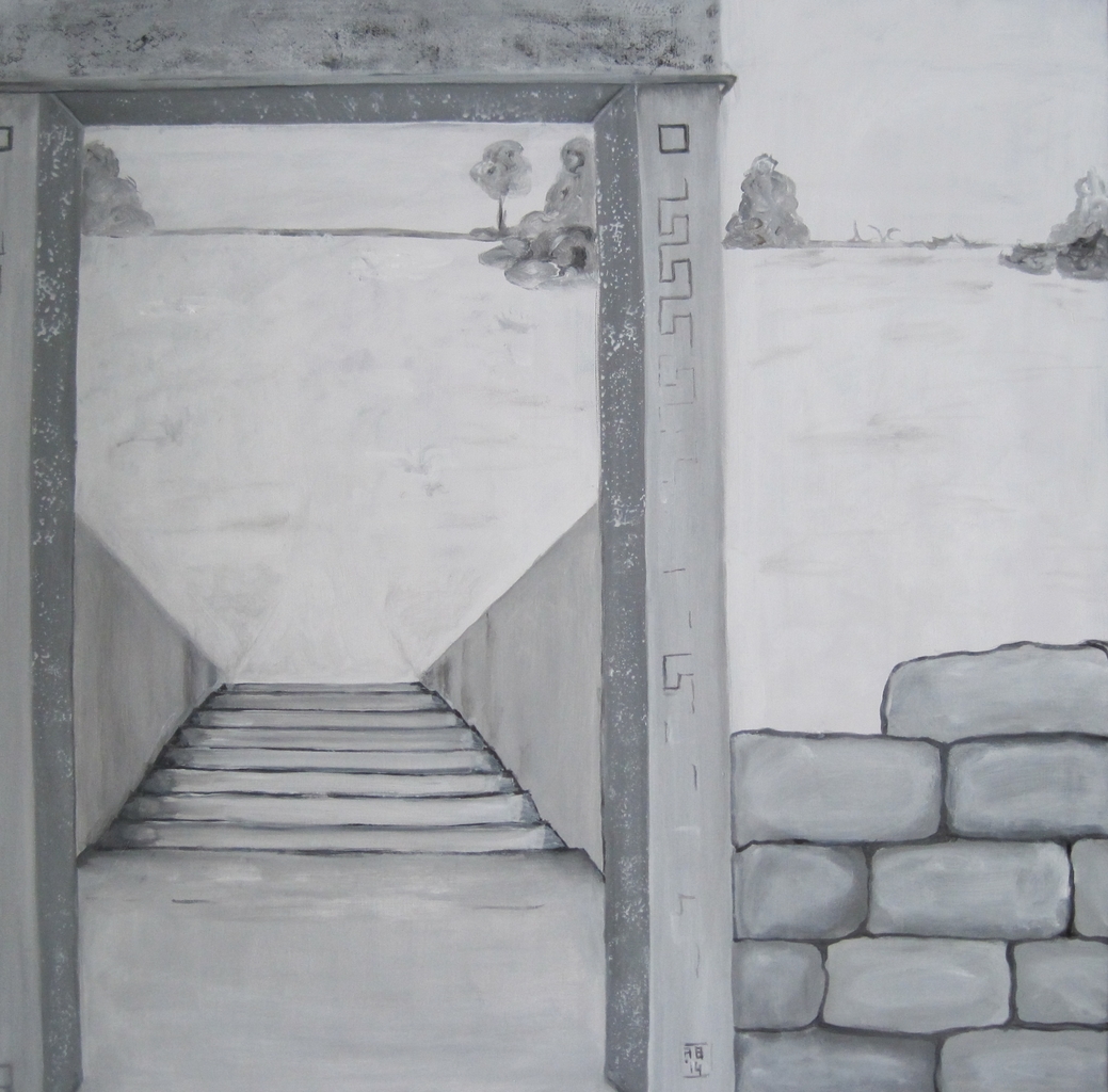 Uitzicht vanaf plateau op trap met oud Grieks monument, in zwart, wit , grijs en zilver