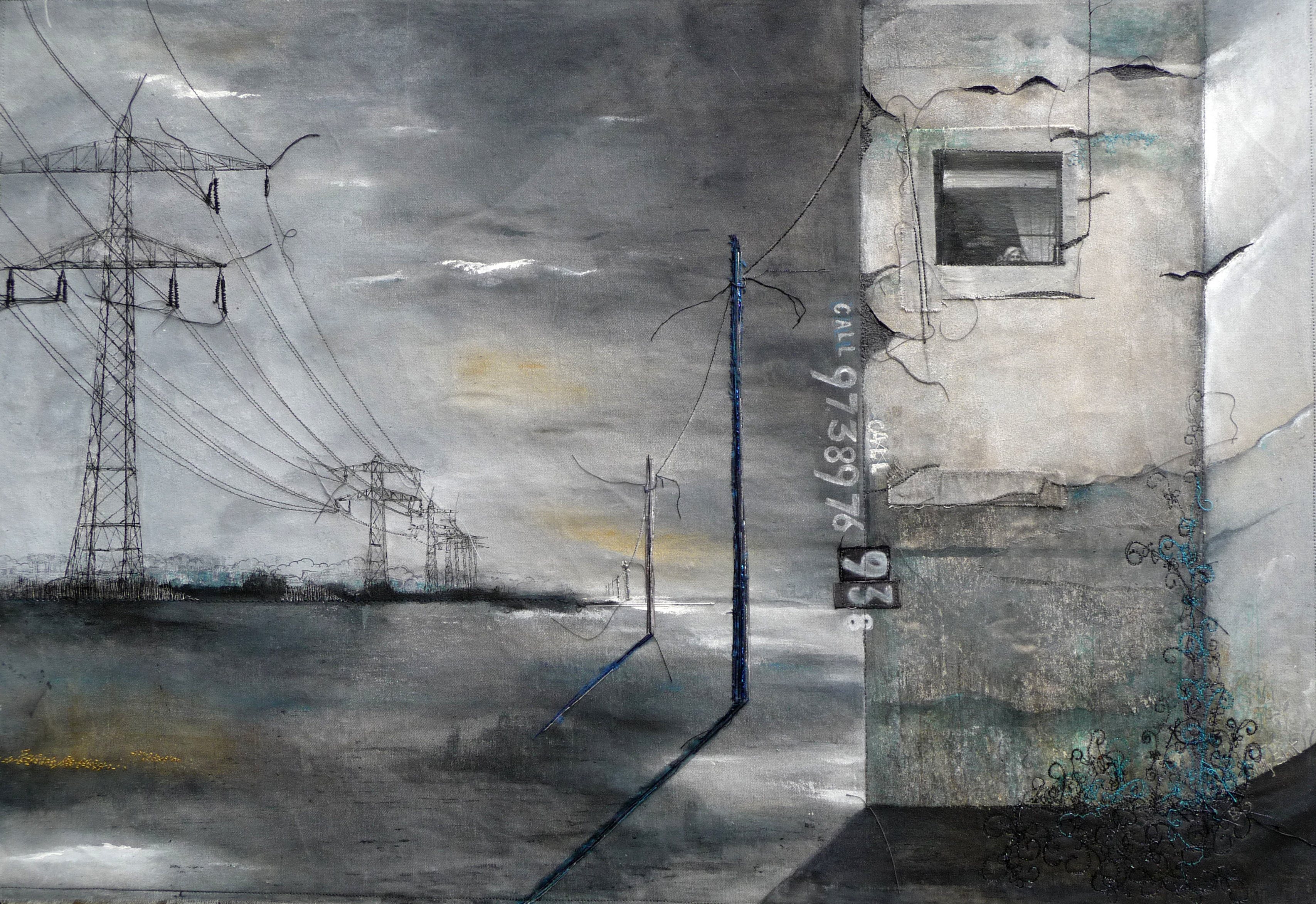 Gemaakt in mixed media, met textiel, machinaal borduurwerk, transfer paper en verf.