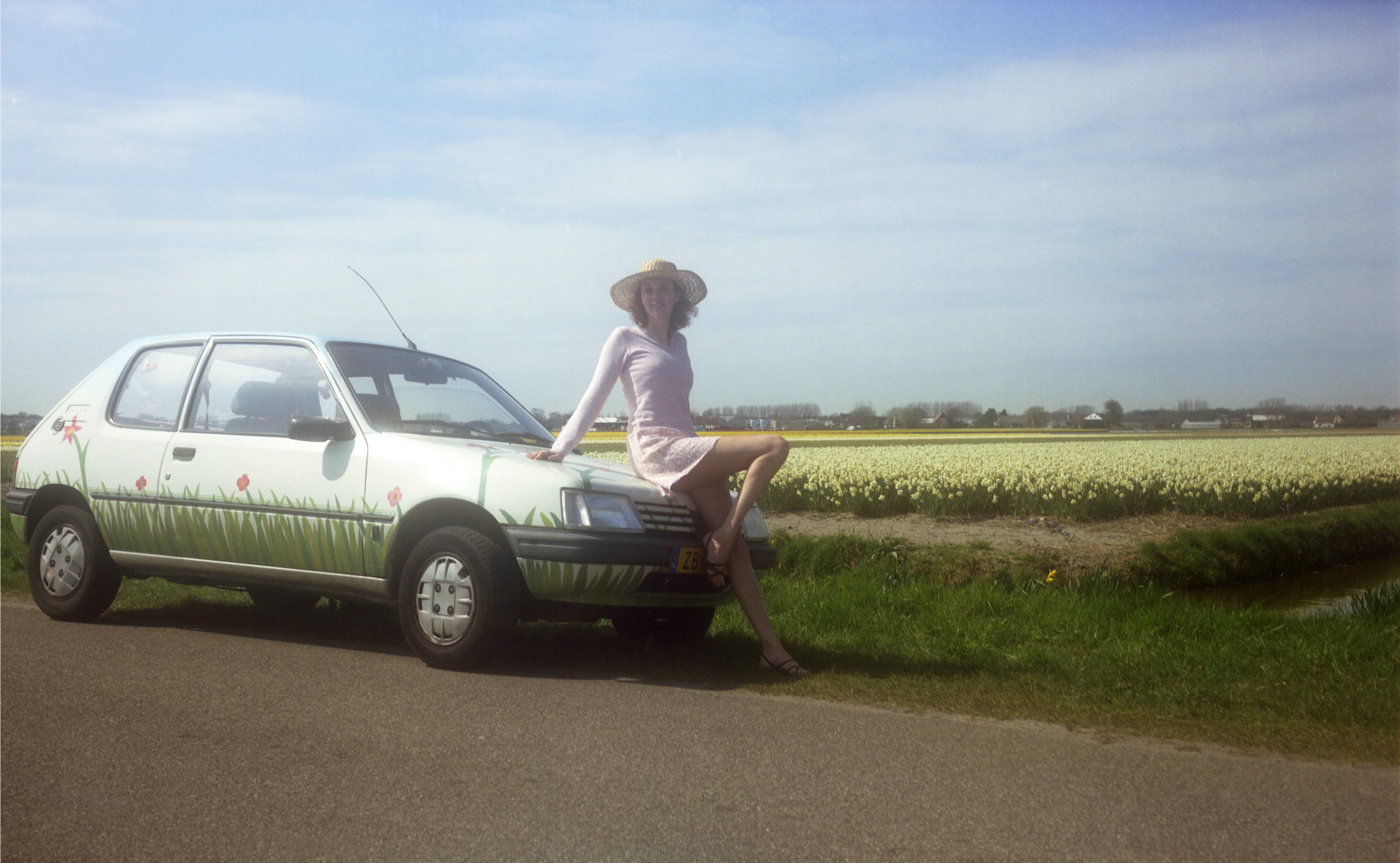 Foto van jonge vrouw voor bij een beschilderde auto met op de achtergrond bloeiende bollenvelden C-print op 1.5 mm aluminium voorzien van ophangsysteem. Tegen meerprijs ook beschikbaar als Plex-photo
