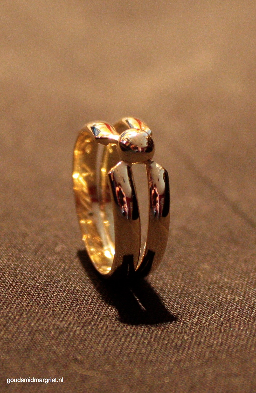 2 Trouwringen (vader-moeder)vermaakt naar 1 Damesring Het verhaal: Het verhaal van deze ring is deze: Deze damesring heb ik gemaakt voor een mevr. die de trouwringen van haar dierbare overleden ouders tot 1 damesring vermaakt wilde hebben. Het bolletje in het midden is samengesmolten goud wat ik over had van het op maat maken van de 2 ringen. Het bolletje stelt dus zijzelf voor.