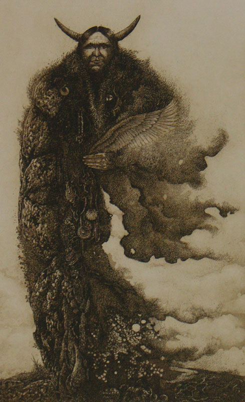 Tovenaar verbonden met steen-lucht-aarde (zie ook Taal der vogels)