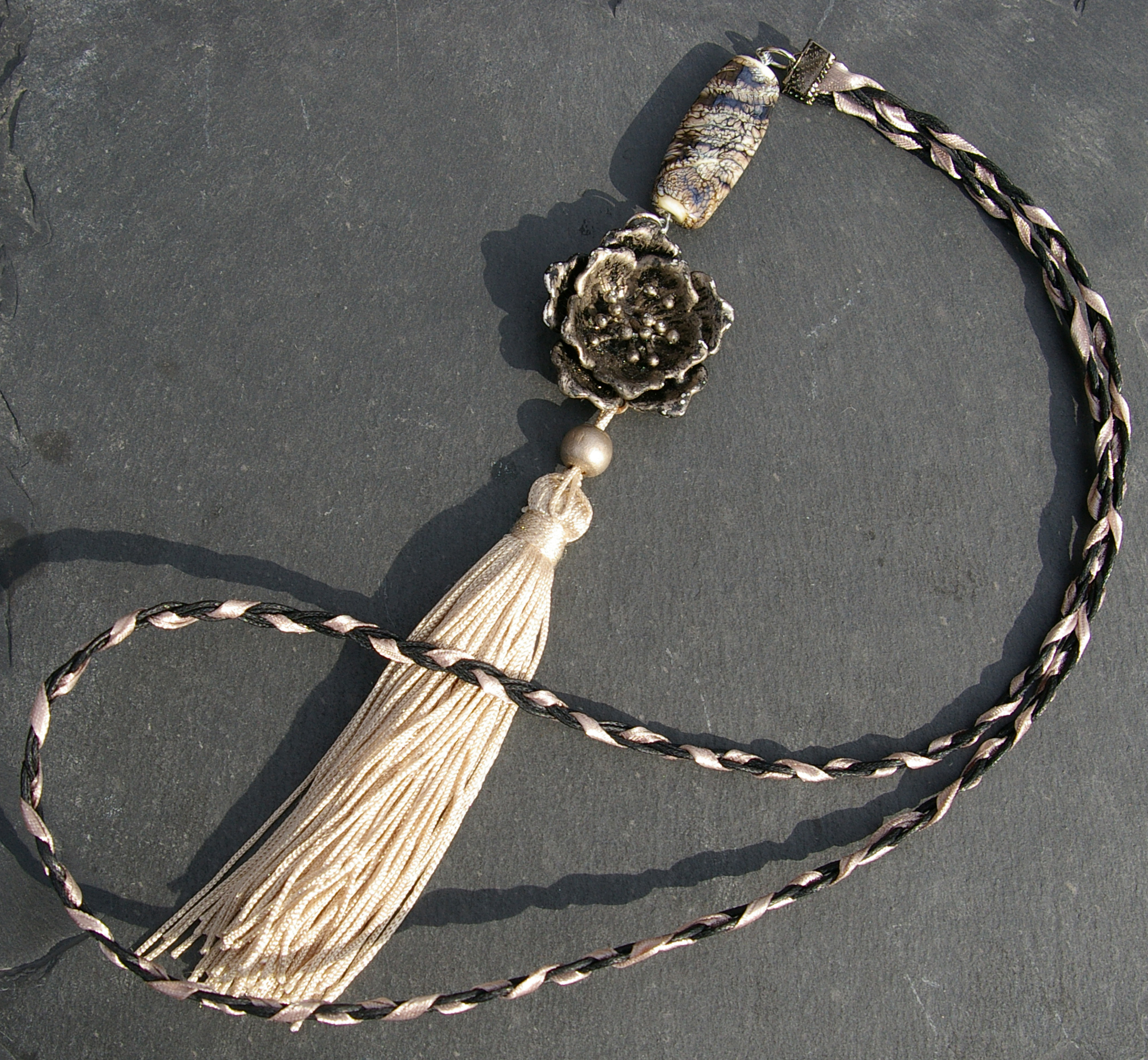 Lange ketting met lange, platte handgemaakte kraal. De kraal is bewerkt met glas wat glinsterd als metaal. Onder de kraal hangt een metalen bloem ornament met een groot kwastje.