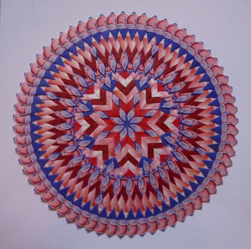 Ik ben geboren in 1945 en ben met het maken van mandala's begonnen toen ik ophield met werken. Ik heb 2 dochters en 5 kleindochters. Sinds ik in april 2008 (samen met mijn dochter en een vriendin)een workshop mandala's van theezakjes heb gevolgd, ben ik er dagelijks mee bezig (als het effe kan). Het is erg rustgevend. Van mijn mandala's maak ik wenskaarten met mandala's en een spreuk of gedachte en die heb ik laten drukken.