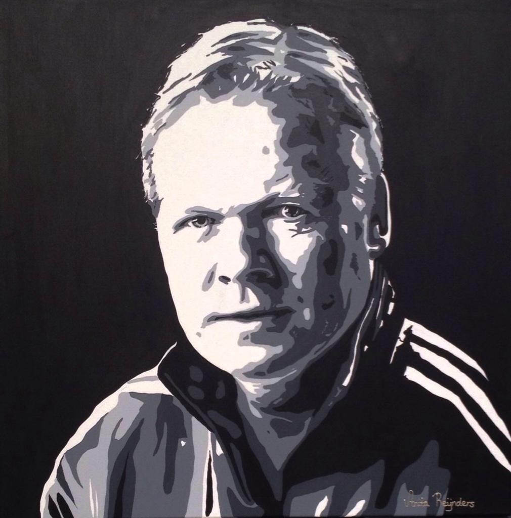 Portret Ronald Koeman geschilderd in opdracht van Bartina Koeman. portret is als kado gegeven in landhuishotel De Bloemenbeek in de Lutte, tijdens het afscheid van de technische staf van Feyenoord op 9-05-2014 .