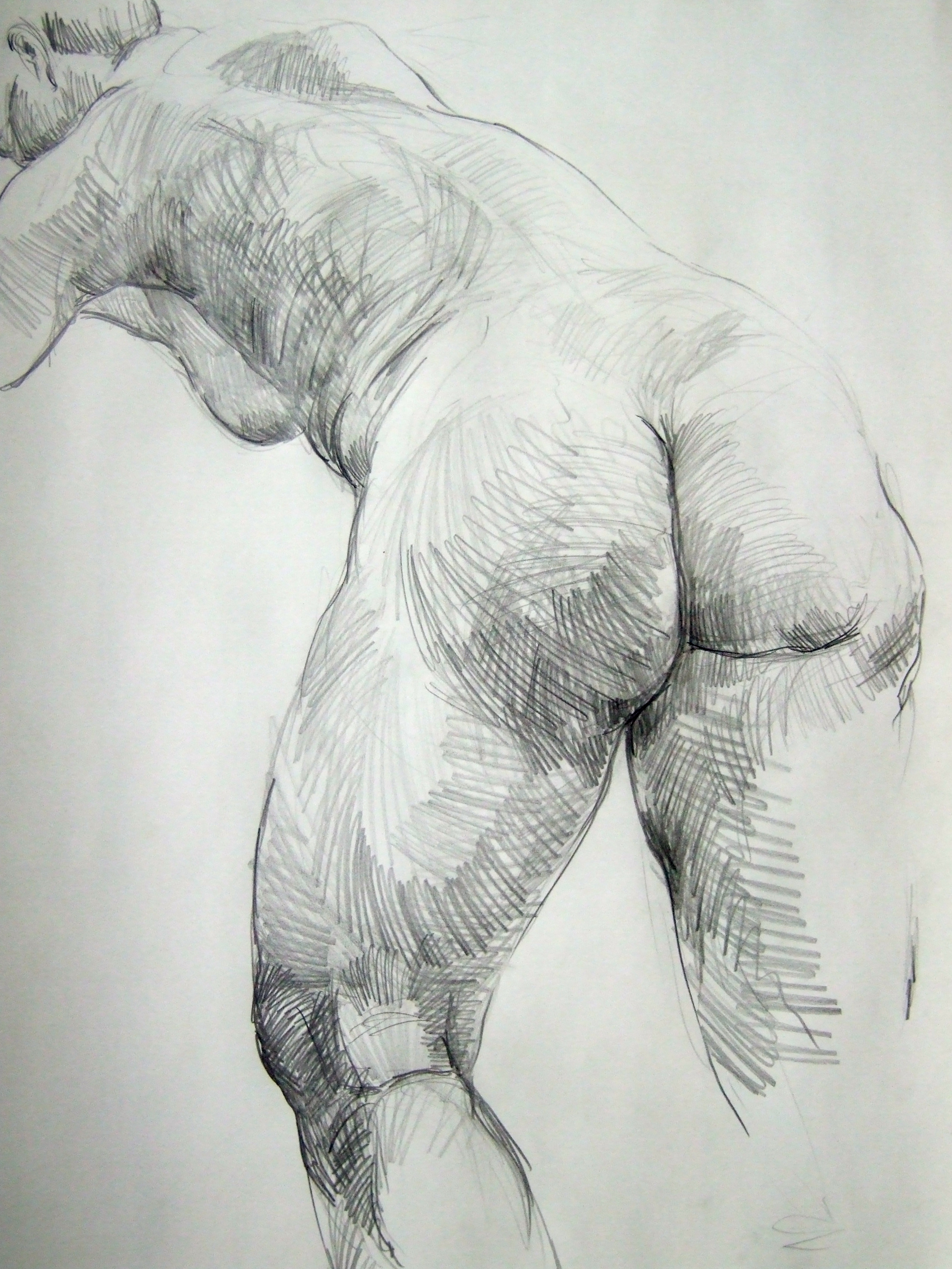 Vrouw Naakt Potlood Model Figuur Schets Rug Staand Leunend Studie