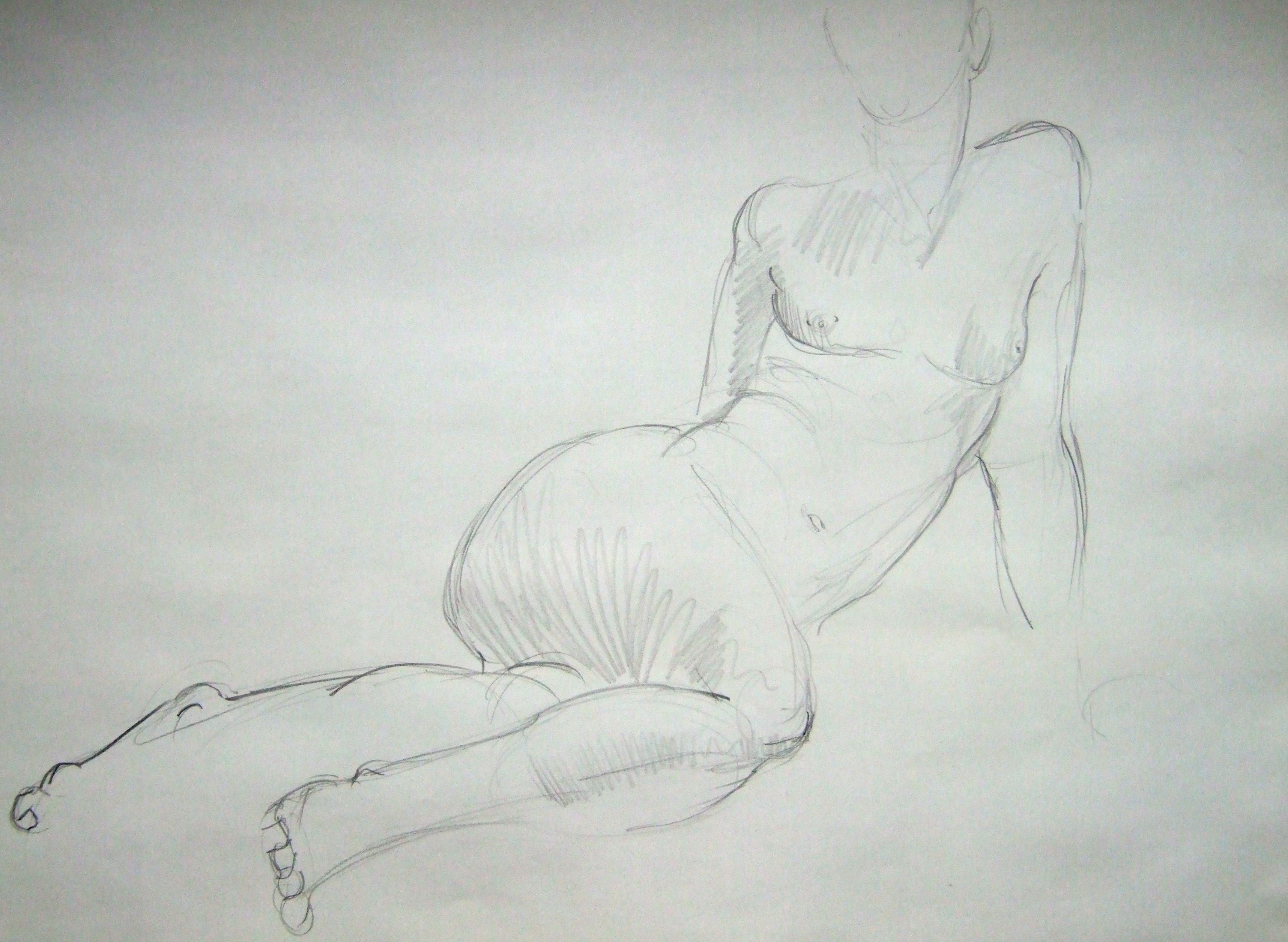 Vrouw Naakt Potlood Model Figuur Schets Frontaal Achteroverleunend Studie