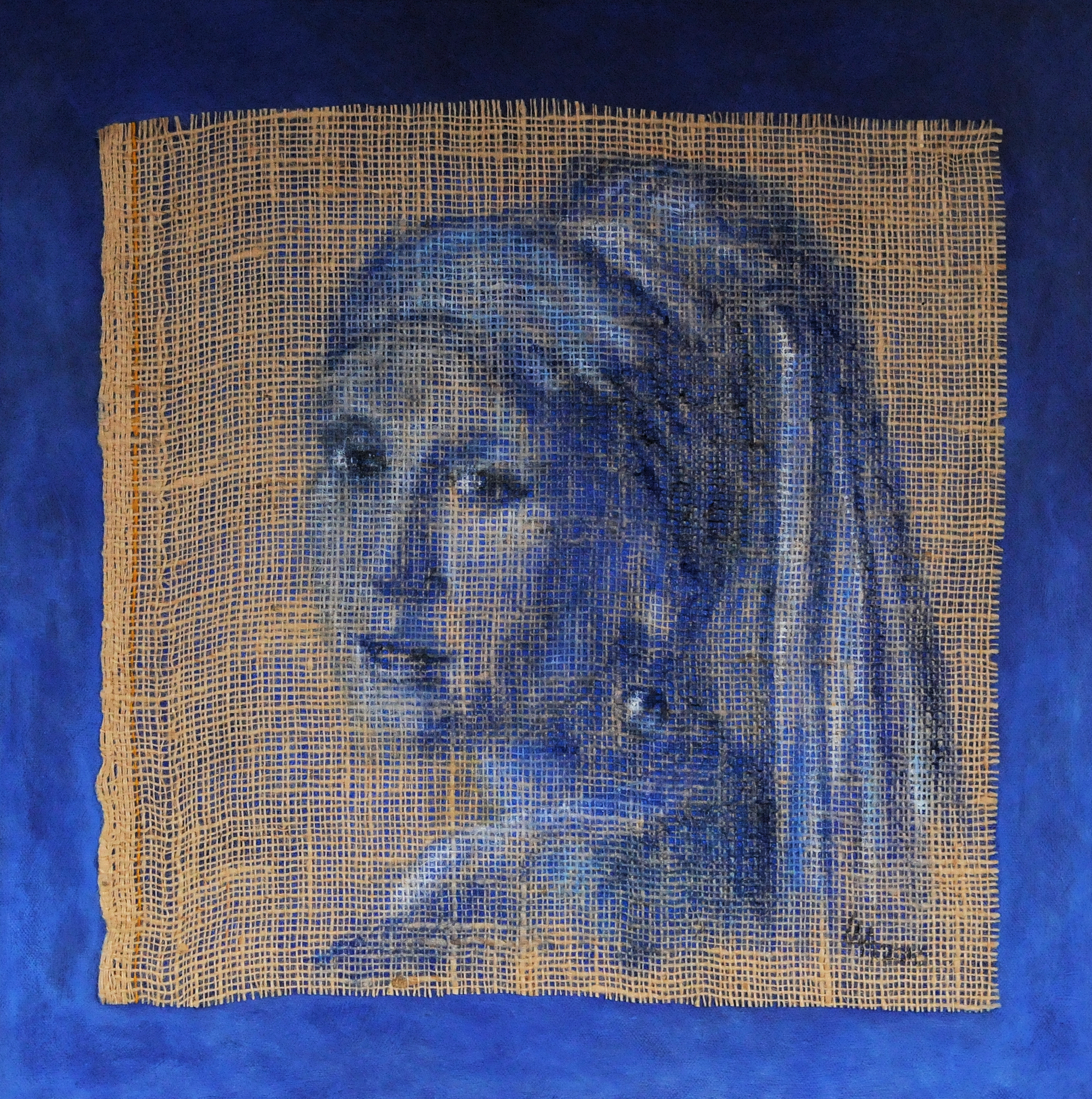 Geinspireerd door Vermeer, een oude meester. Daarom hierbij ook gekozen voor een oud materiaal als jute.Het jute is geplakt op een beschilderd 3D doek. Het is uitgevoerd in Delfts blauwe kleuren, omdat Delft de geboorte- en woonplaats is geweest van Vermeer. Verkocht