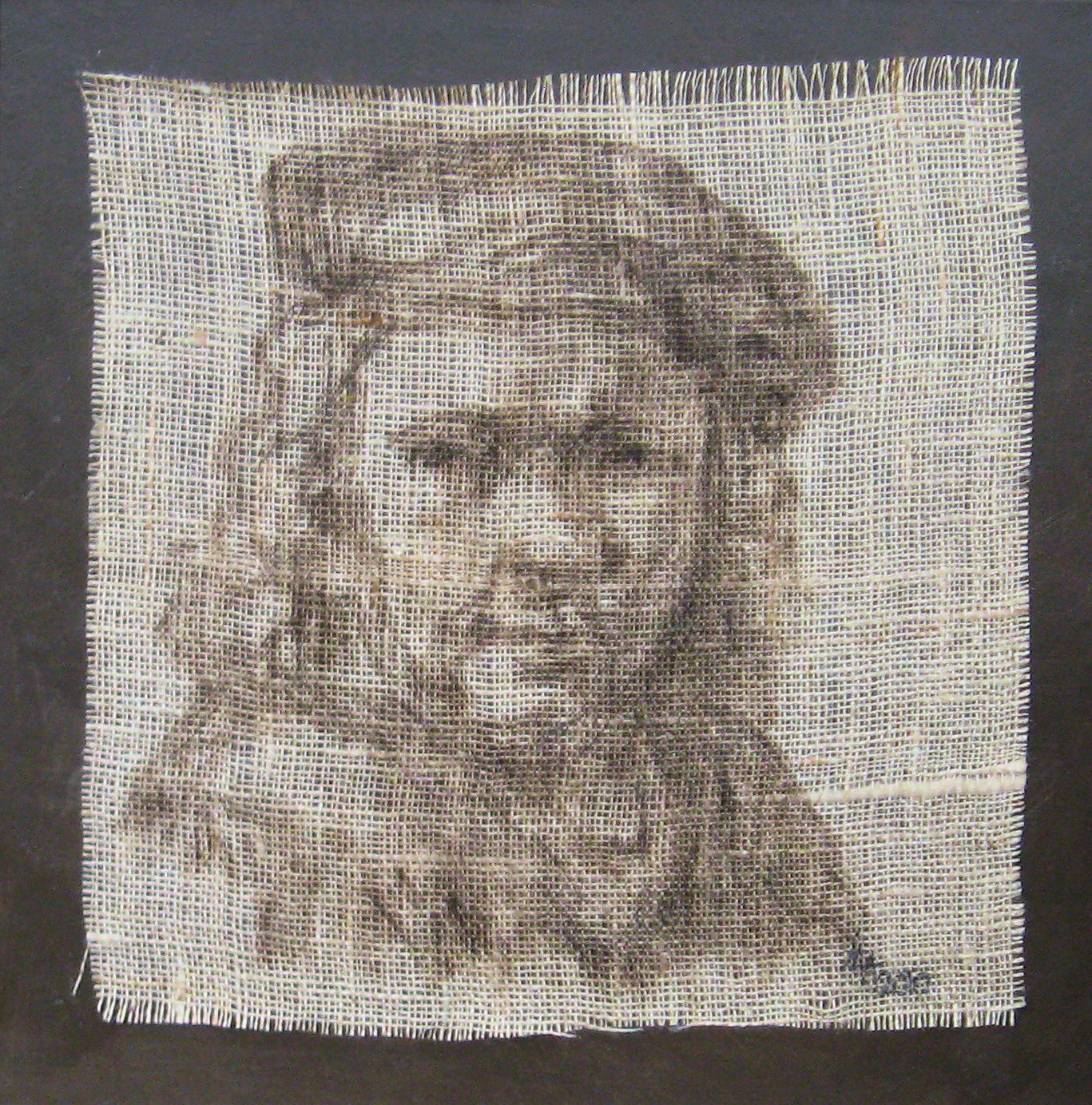 Een schilderij gemaakt naar een zelfportret van Rembrandt. Omdat het een historische afbeelding is heb ik ervoor gekozen het portret te schilderen op een oud materiaal als jute. Dit jute is geplakt op een bruin geschilderd 3D doek zodat het jute mooi glad blijft.