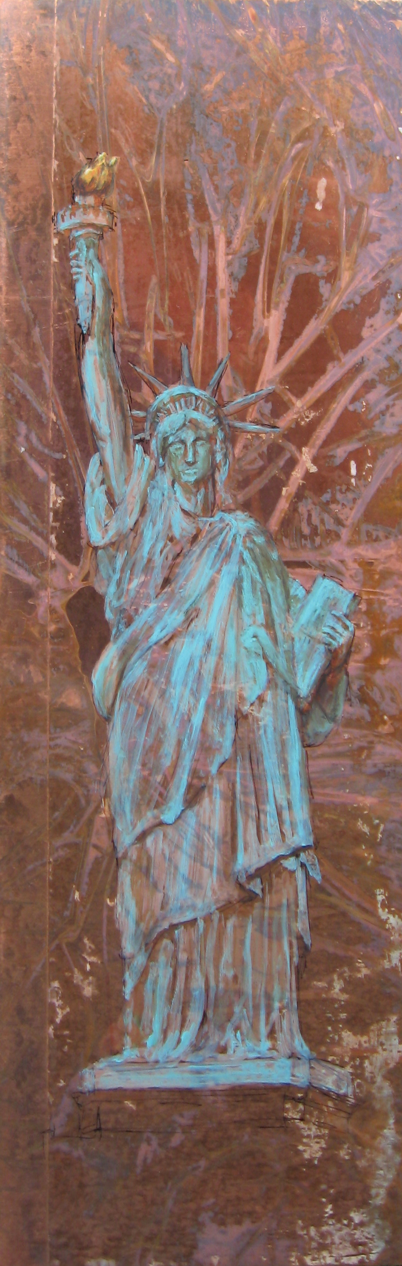 Lady Liberty in acryl geschilderd op geoxideerd koper, voorzien van vernislaag en ophangmechanisme.