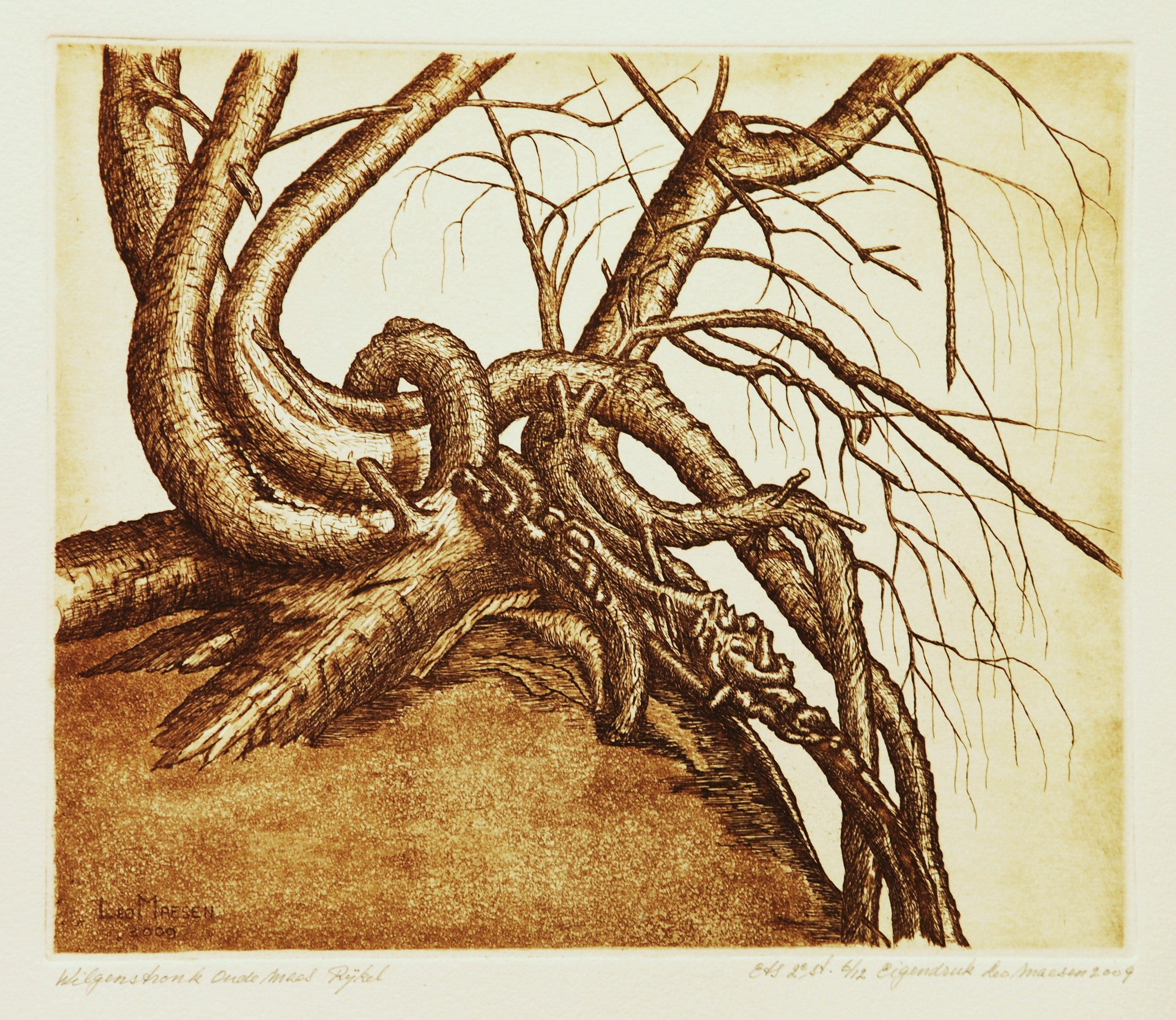 De oude wilg door een storm ontworteld heeft tegen alle verdrukking in weer opnieuw stammen gevormd op de oever van de Oude Maas in Rijkel Gemeente Beesel. In de ets heb ik vervreemdingen aangebracht. 12 afdrukken.