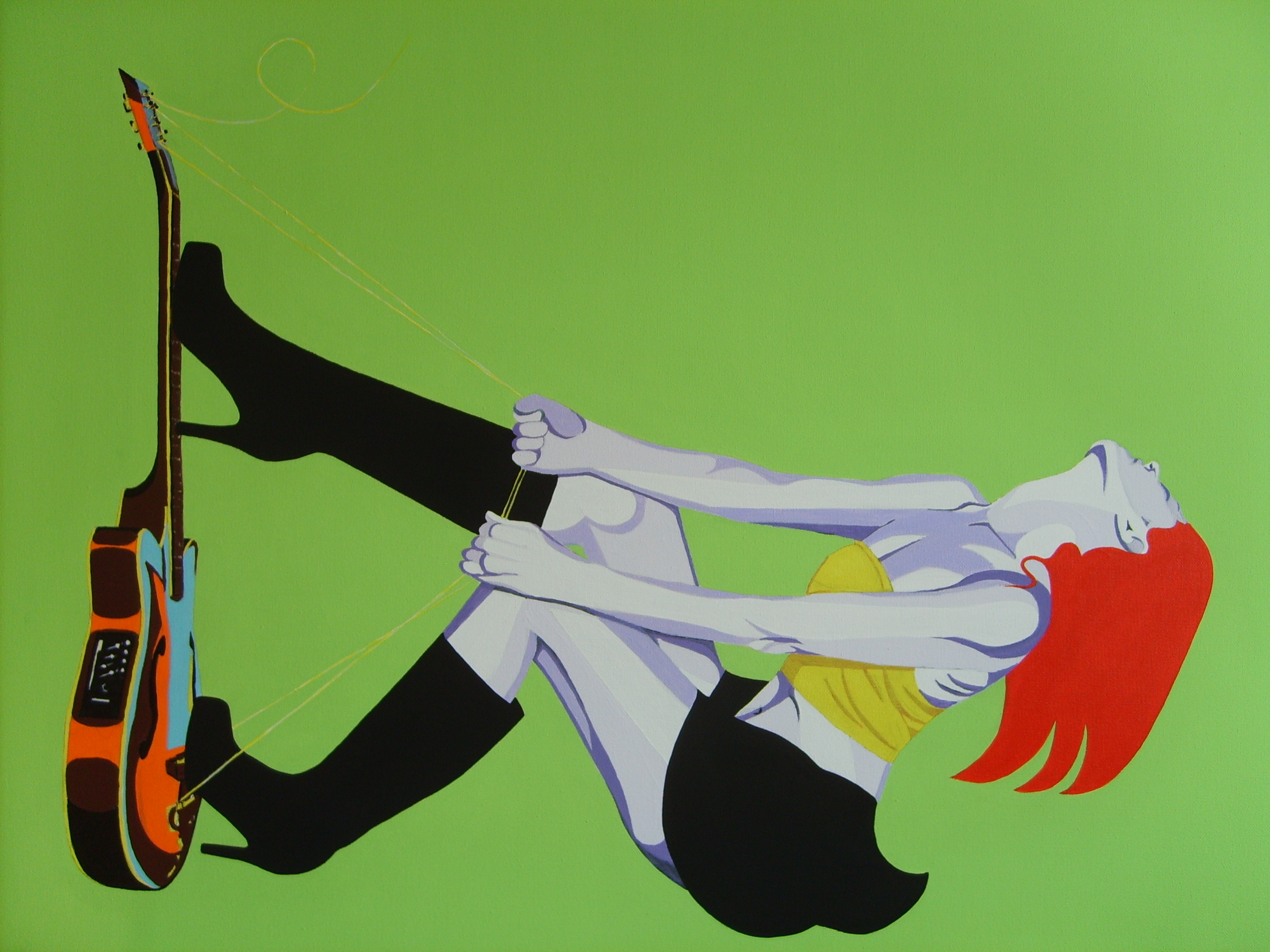 Violette dame trekt gitaar aan gort, op appeltjesgroene achtergrond