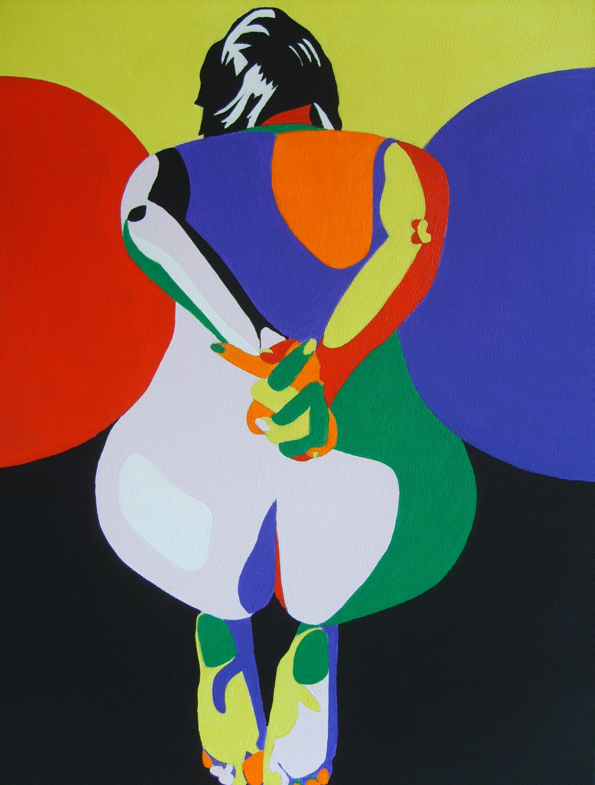 Voorovergebogen op de knieën, in felle kleuren