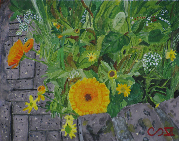 Wat bloemen bij een oprit, kwam er bijna dagelijks voorbij gelopen Niks bijzonders misschien, maar op een dag pakte het me gewoon. Moest het gewoon schilderen. Op canvasboard geschilderd.