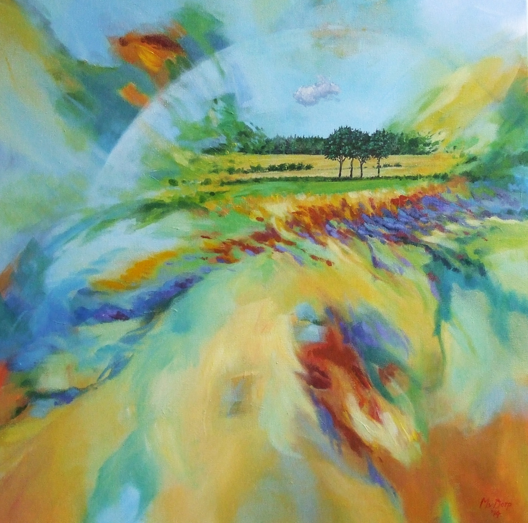 De duidelijke realistische vormen van een duits landschap nabij Keulen was mijn uitgangspunt. Vandaar uit liet ik de vormen steeds meer los door mijn aandacht naar mijn innerlijke beleving te verplaatsen.