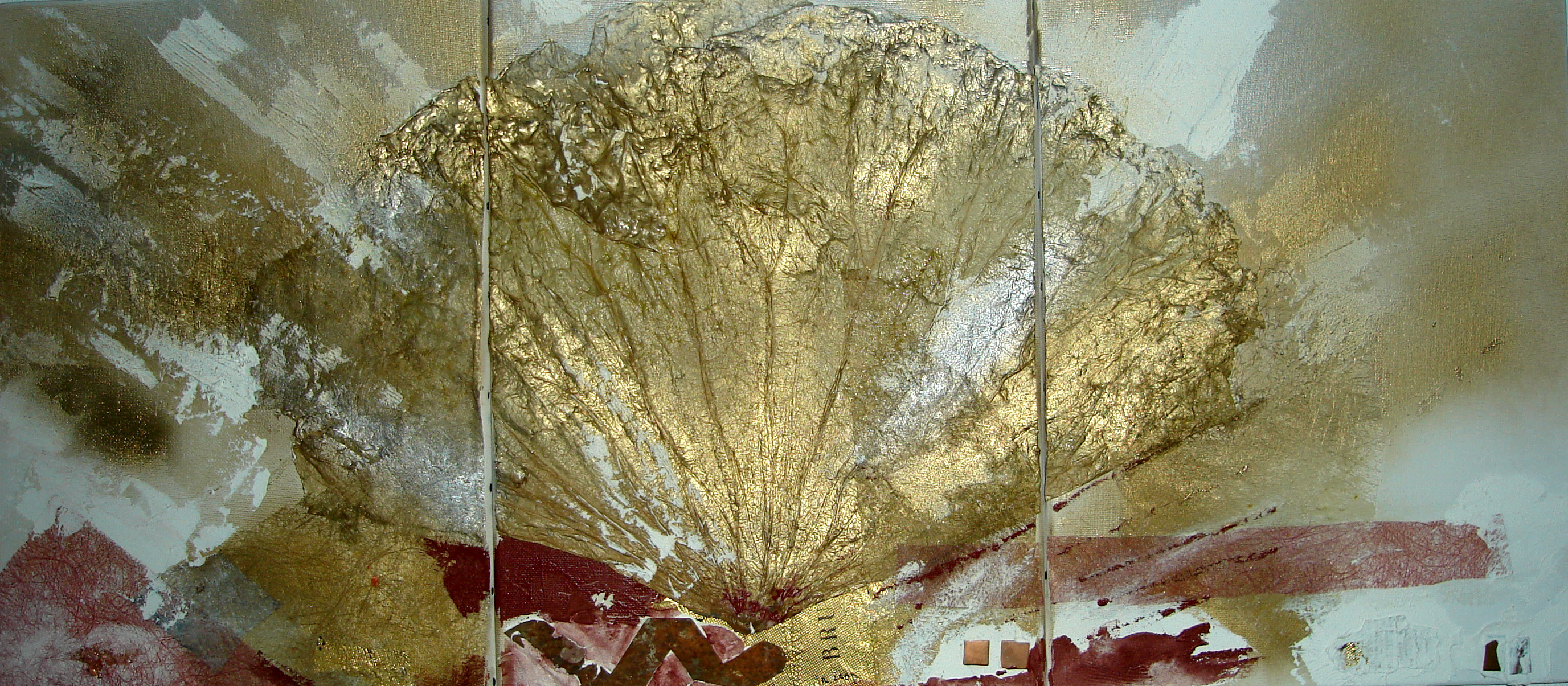 Een drieluik van gedroogd lotusblad die de kleuren van de ruimte vertegenwoordigen