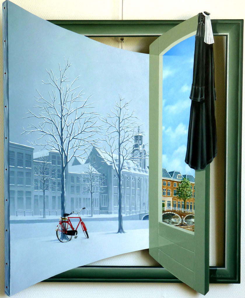 Eric Kerkvliet schildert met olieverf uiterst gedetailleerd voorstellingen op iets verhoogd paneel waardoor bij juiste belichting een Trompe-l’oeil-achtig effect ontstaat.