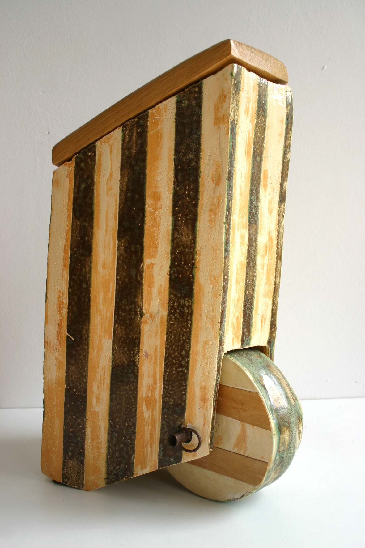 Keramische wielschaal gecombineerd met diverse materialen als hout en ijzer, maar met keramiek als uitgangsmateriaal.