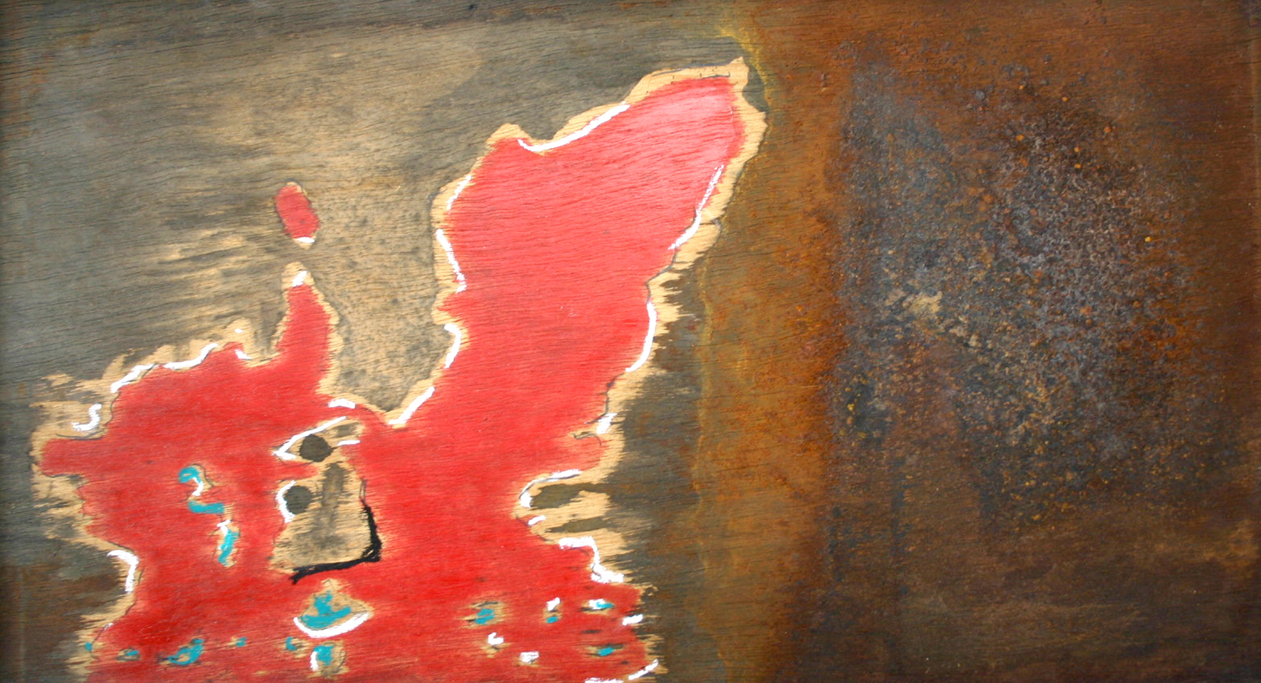 Schildrij op een houten paneel beschilderd met diverse technieken. Abstracte voorstelling van een luchtfoto.