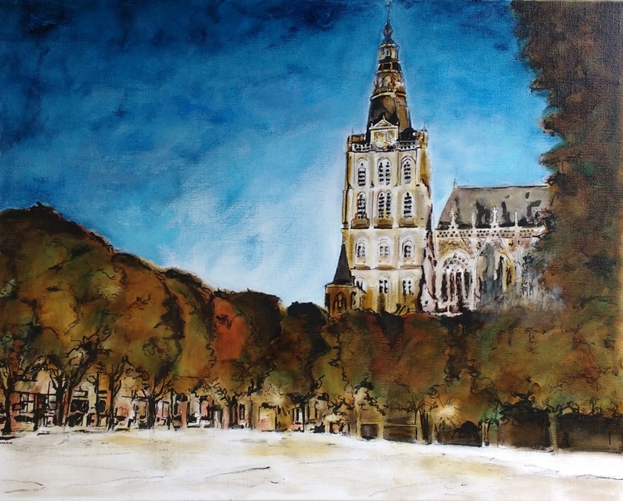 Sint Jan Kathedraal aan de Parade te 's-Hertogenbosch. Getekend en geschilderd met rietpen en penseel in drie kleuren inkt (o.a.Oost-Indische inkt) en acrylverf op linnen doek 80x100 cm.