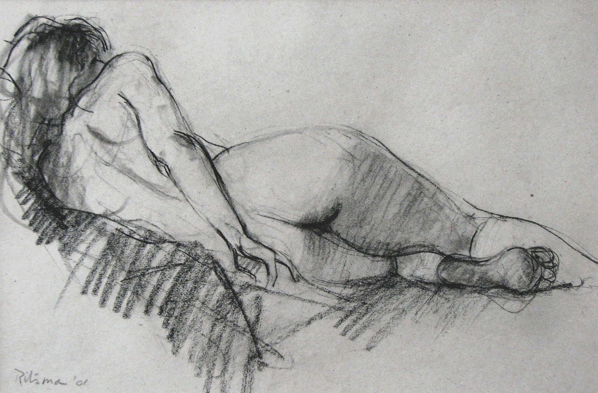 Liggend vropuwelijk rugnaakt (krijt op grijs papier)