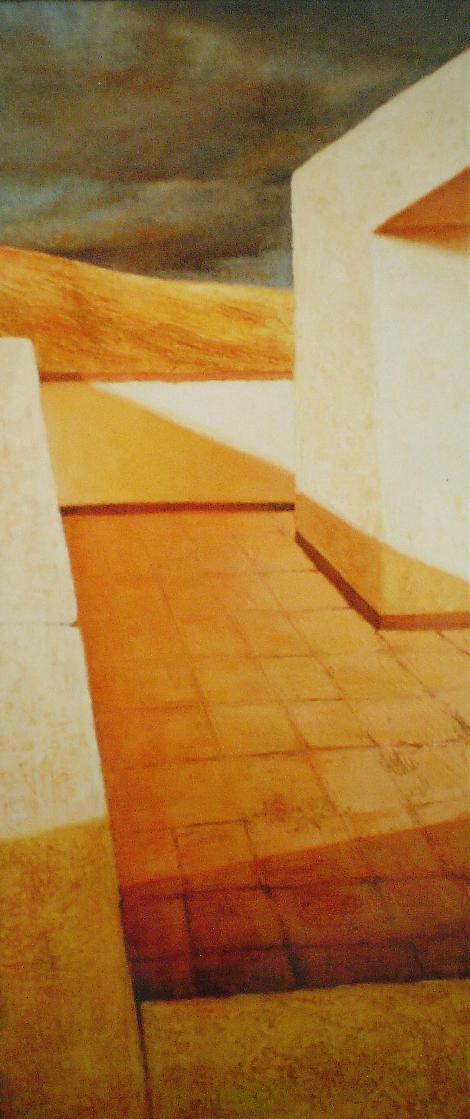 De lage avondzon zorgt voor de lange schaduwen die de vorm van de begrenzende muren accentueerd en ons de indruk geven het pad verder te kunnen bewandelen.