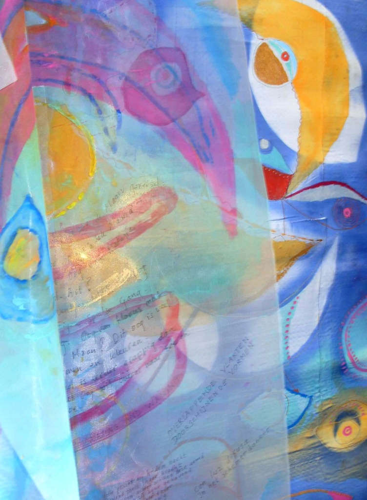 Er is een schildering ontstaan over de maan en het oog, met een voile vormen ze een mooi geheel in de natuur of binnen. Geschilderd op bamboe gordijn en dun voile.