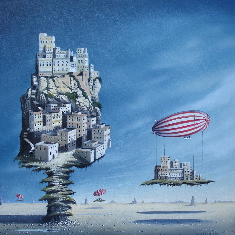 Bas Verkade schildert surrealistische taferelen (olieverf) met fotografische precisie.Zeer verfijnd werk op papier ,doek en paneel.