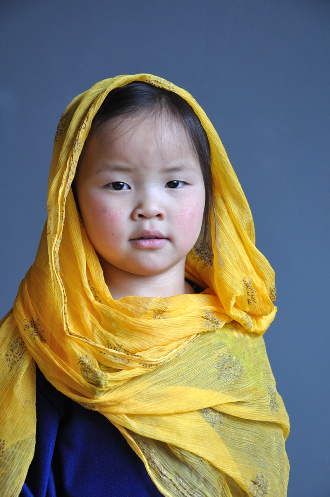 Meisje Geel Kind Portret Verkleden Sjaal Hoofddoek Chinees Geposeerd