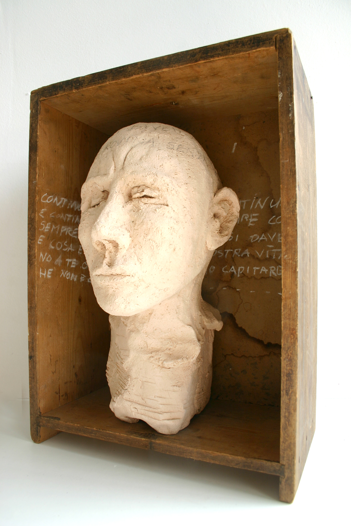 Keramich portret in een houten lade met aan binnenkant allerlei gedachten genoteerd.