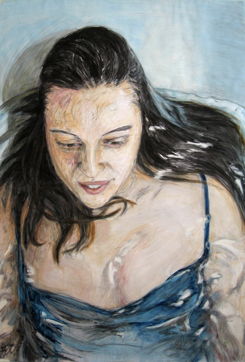 Wanneer je een bad neemt of doucht, staat de tijd even stil. Het is een moment waarop je in gedachten verzonken bent en daardoor afwezig lijkt voor de omgeving. Ik schilder die momenten graag; meestal is dit een mens in een introverte houding. Doordat deze mens jou als toeschouwer niet aankijkt, kun je ook een beetje rondkijken en overpeinzen, meedelen in dit moment.