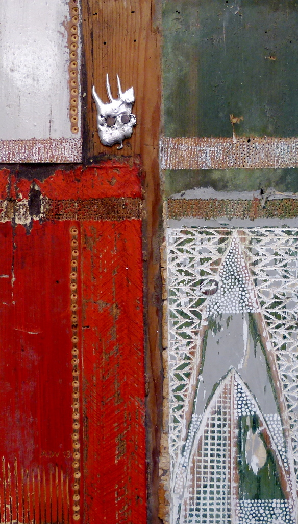 Oud plankje met oorspronkelijke kleuren: rood, grijs, groen. Bewerking met priem, zaag, boor, schuurpapier. Toegevoegde kleur wit. Figuurtje in soldeertin.