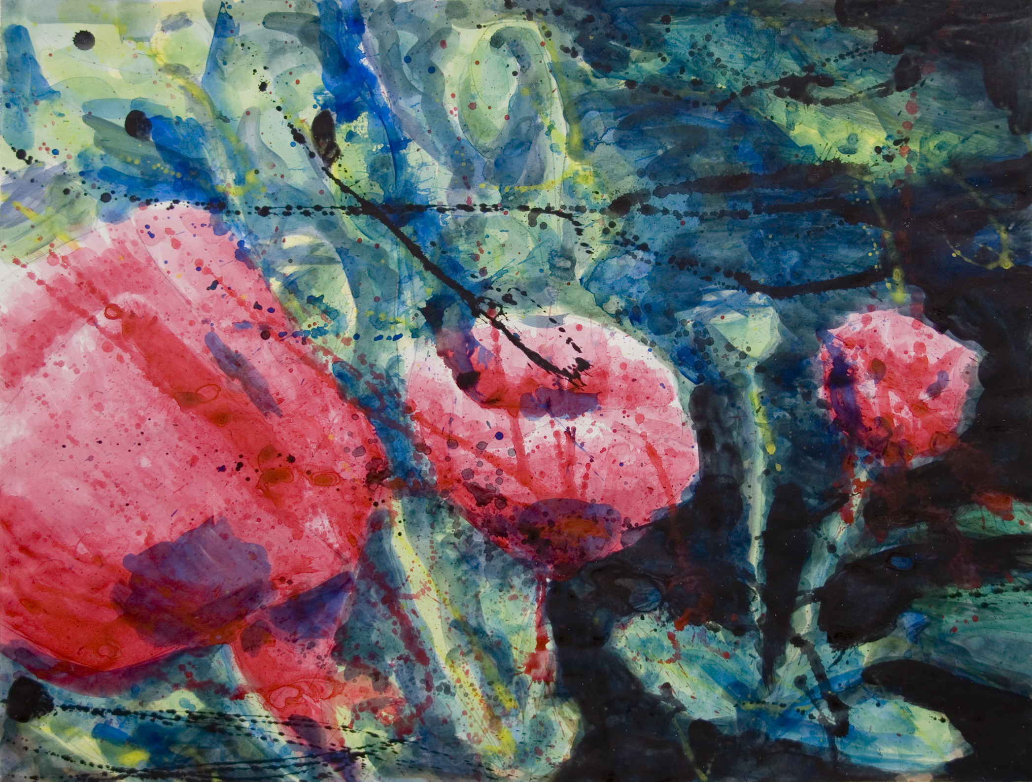 Hetzelfde beeld als papavers (1) en (2), maar nu in een veel transparantere uitvoering van de acrylverf met veel expressieve bewegingen.