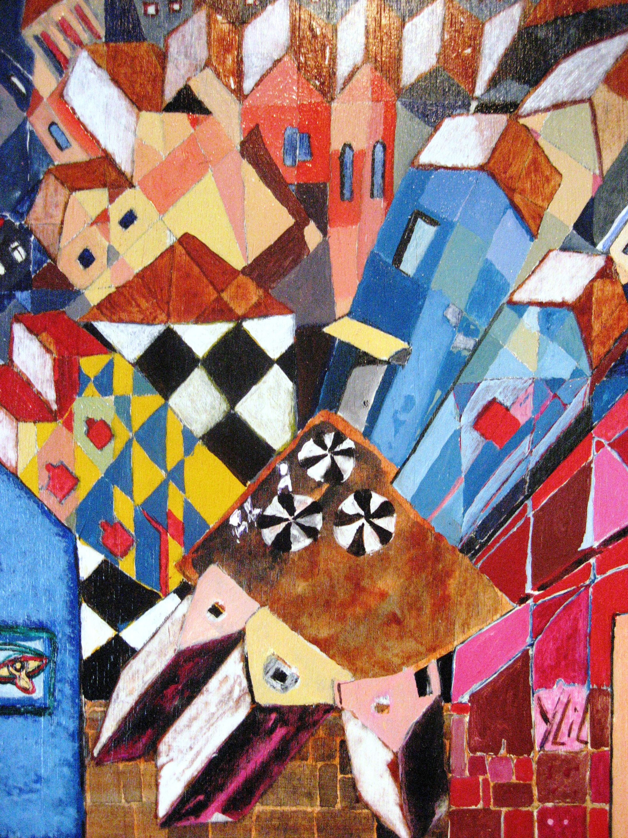 stadje van bovenaf gezien, je wordt er als het ware ingezogen, verder geen enkele indruk van schaal of dimensie. de voorstelling die uit mijn fantasie komt is slechts aanleiding voor de handeling: het schilderproces. Het is dit proces dat als het ware van het doekje spat.