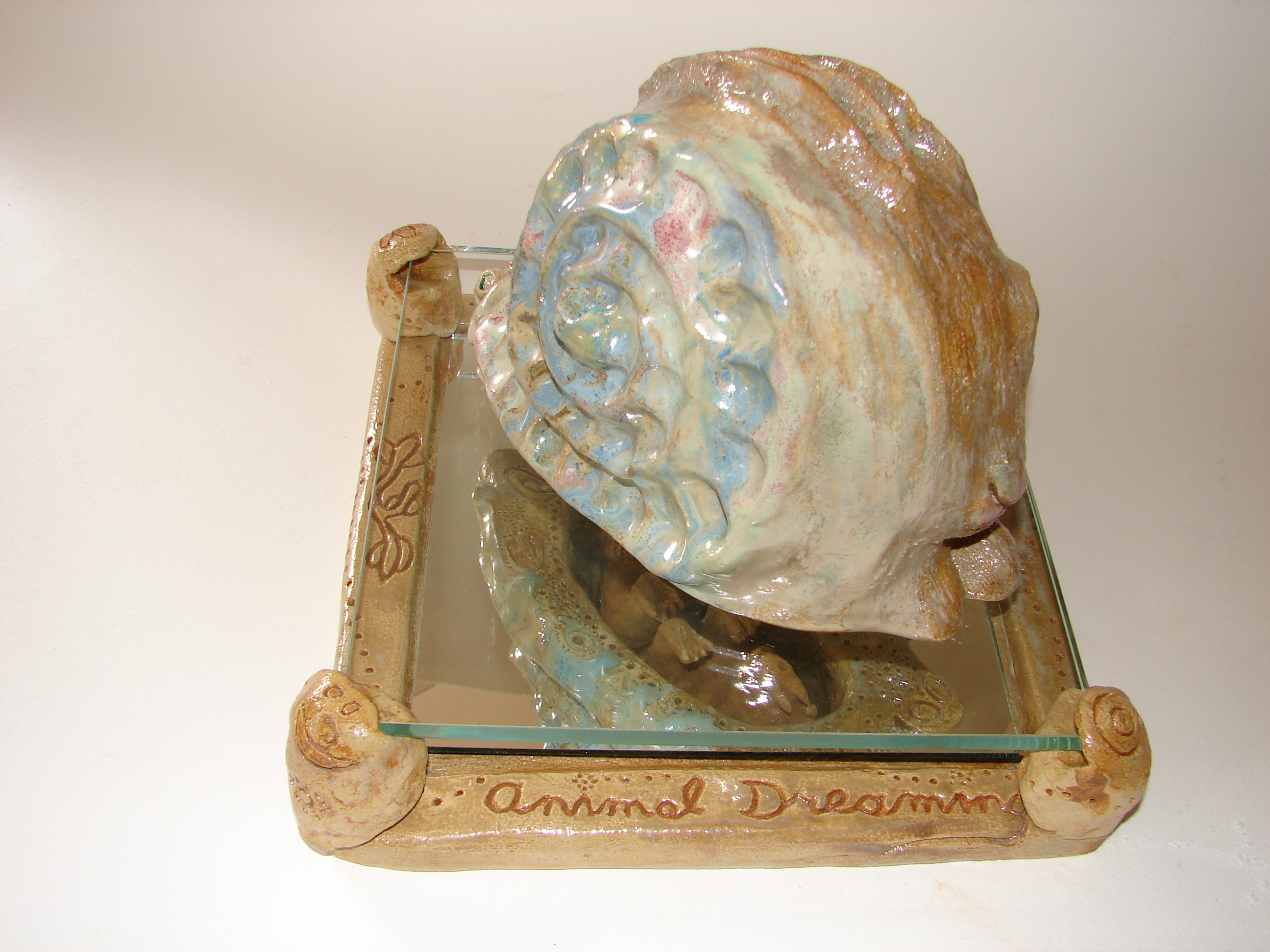 'Animal Dreaming: het hol van de Australische Woestijnduivel' is geinspireerd op Aboriginal Art en op Australische fauna. Het heeft verschillende aspecten. De hoofdfiguur lijkt een konijntje, maar is aan de andere kant een veelkleurige schelp waar een slak uitkomt. Van binnen is deze figuur hol en bewerkt met Aboriginal symbolen voor heelal, terwijl de onderrand symbolen laat zien voor 'plaats' en 'route' en 'dier' en driemaal het symbool voor 'hart' om de drie dieren te symboliseren die in de sculptuur zijn verwerkt. In de holte schuilt de Australische Woestijnduivel; een soort kameleon met een hard pantser vol stekels en hoorns op het hoofd die aan de neushoorn doen denken. De sculptuur is geplaatst op een glasplaat boven een spiegel. De spiegel ligt in een keramische lijst met de titel, de naam van de maakster, en wederom de Aboriginal symbolen die ook in de sculptuur zijn gebruikt. Gehele sculptuur van witte Valentine clay, with a crystal glaze and fired at 1140 degrees. .