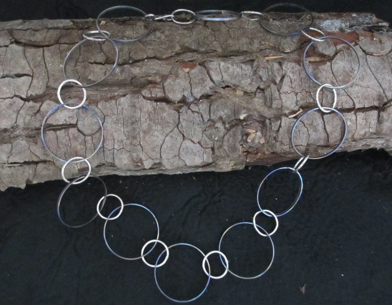 collier bestaande uit gekleurde titanium ringen en gehamerde zilveren ringen