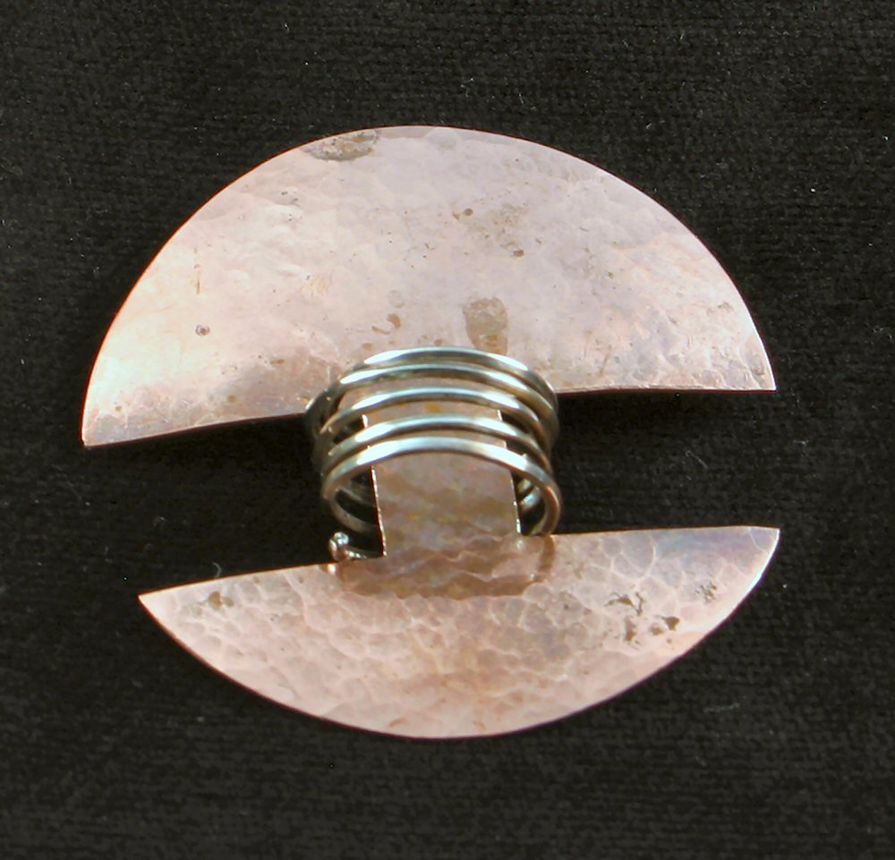 ronde koperen broche gesmeed, met zilveren spriraal