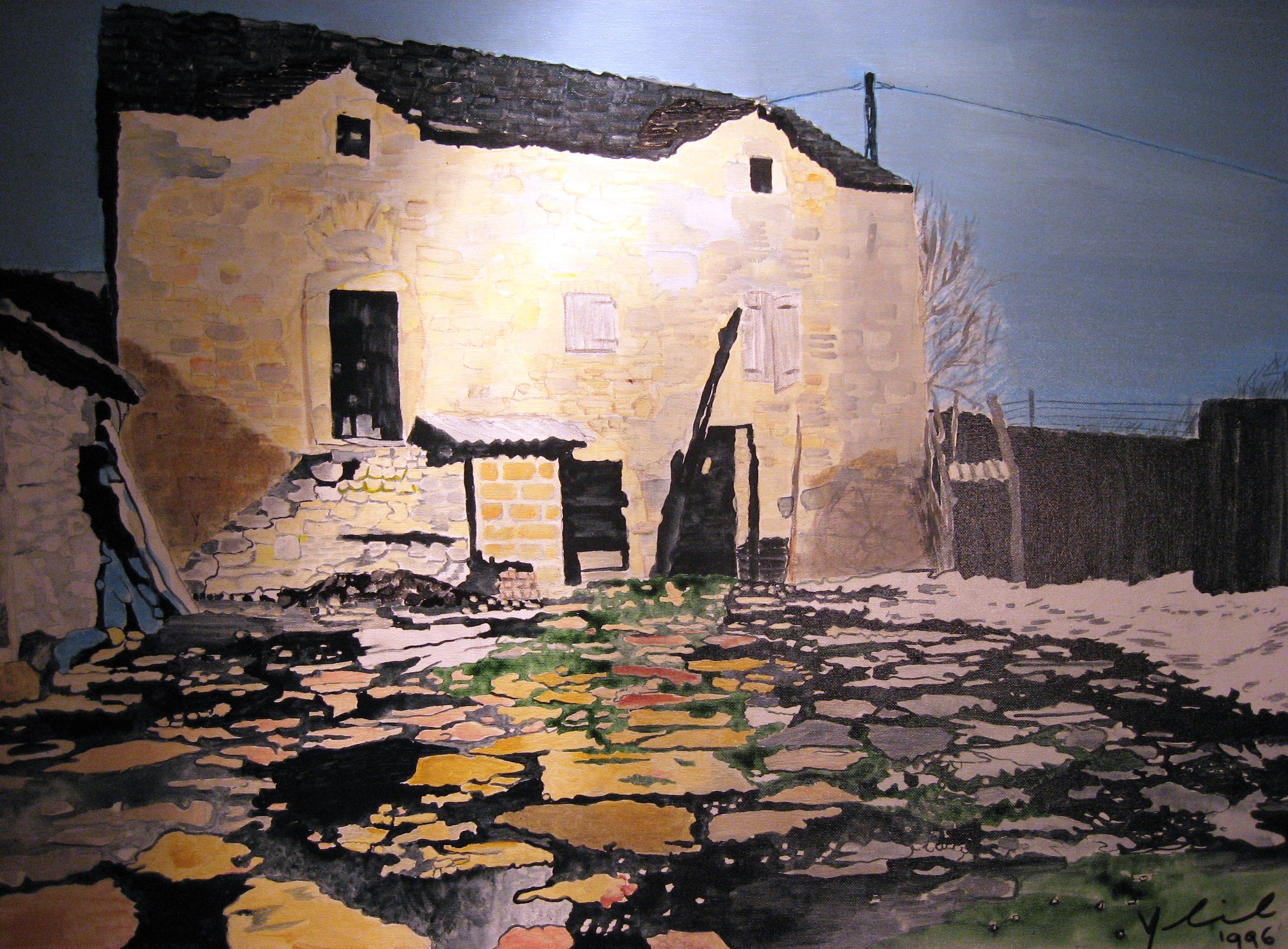 Bij wijze van uitstapje wilde ik eens een keer realistisch schilderen. Dat werden huizen in de Cevennen. Het gaat bij dit schilderij om een verlaten boerderij en een binnenplaats waar nog enige sneeuw ligt. De winter zon creeerde prachtige licht- en kleureffecten.