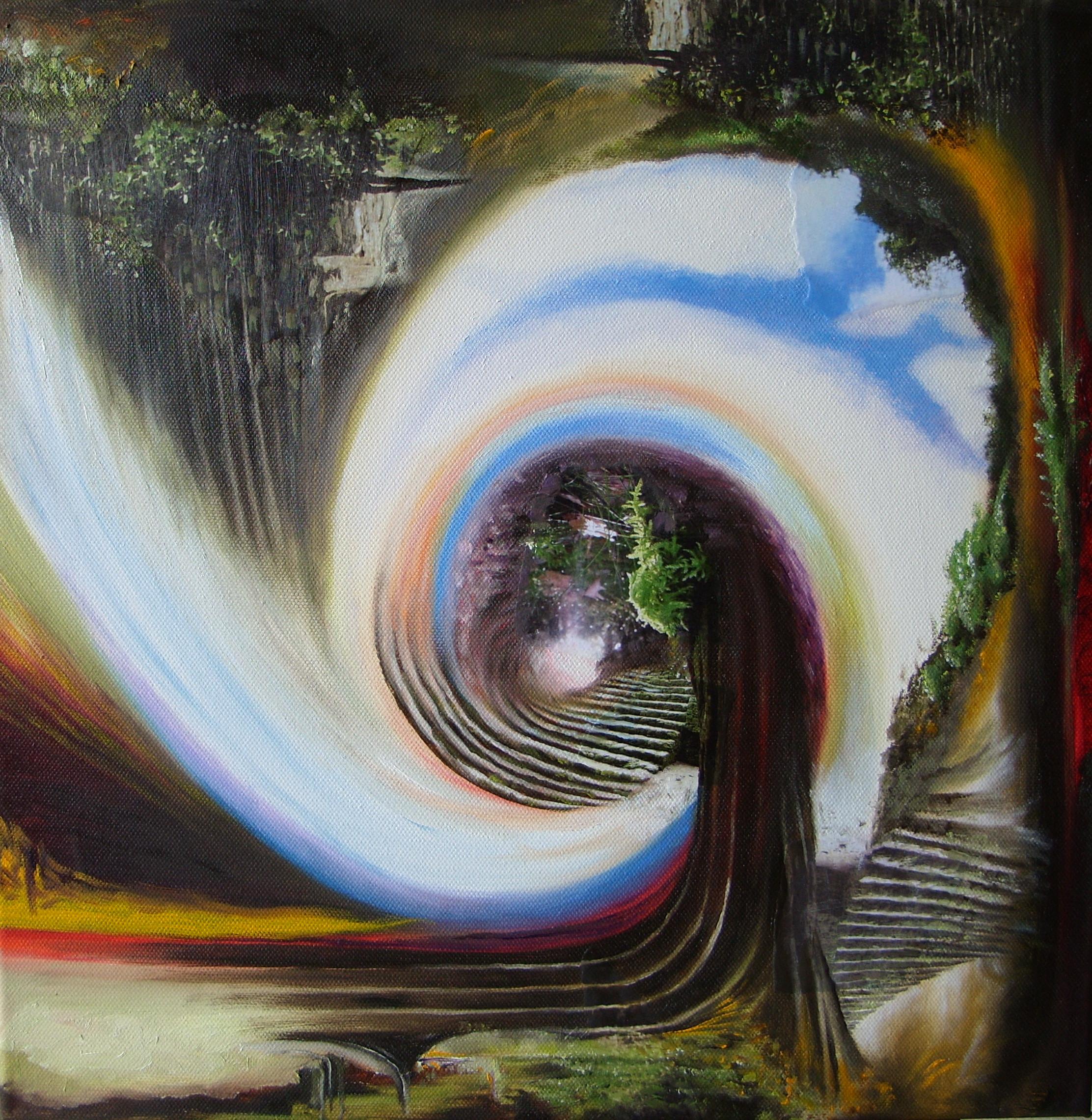 Ver vliegen de tijden uit deze werkelijkheid... over... vloeiend naar een andere en andere en andere dimensie? 3e uit een serie olieverf met fotoscheursels