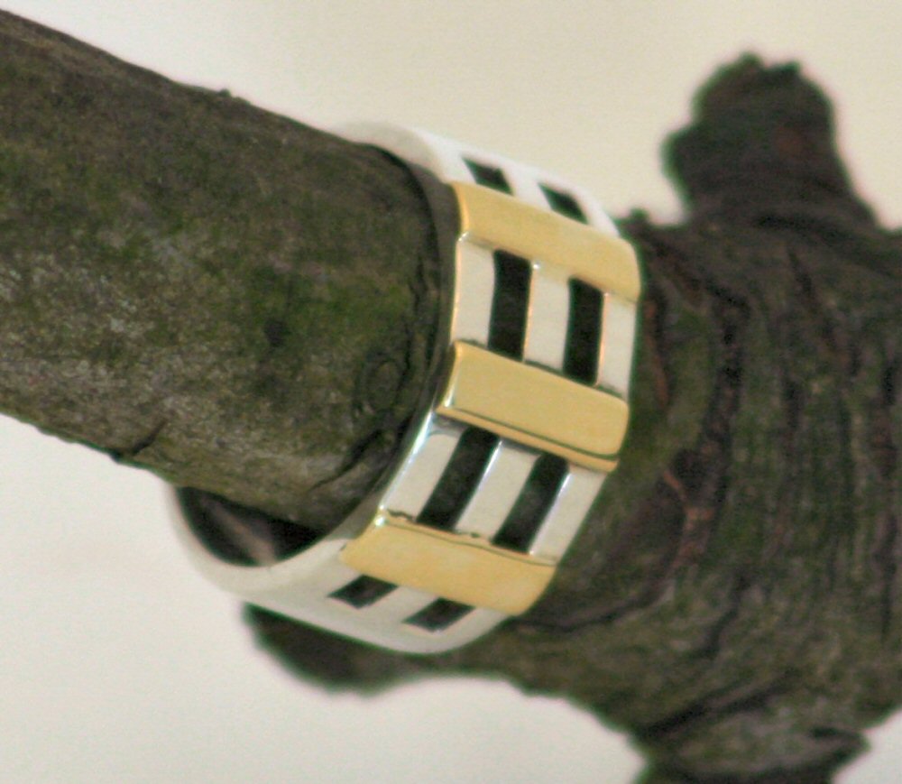 opengewerkte zilveren ring met 3 gouden plaatjes